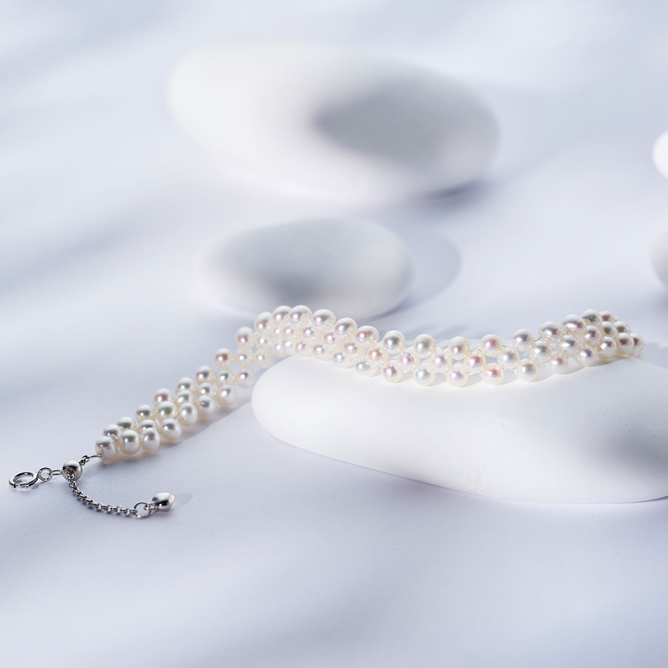 تتميز هذه السوار بألمع اللآلئ ذات الشكل البيضاوي، مع تعديل موضع الحفر لخلق تأثير دانتيل طبيعي بأطوال متفاوتة. يتناغم بشكل جميل مع الفستان الأبيض، مقدماً أناقة أميرية وسحرًا أرستقراطيًا غنيًا