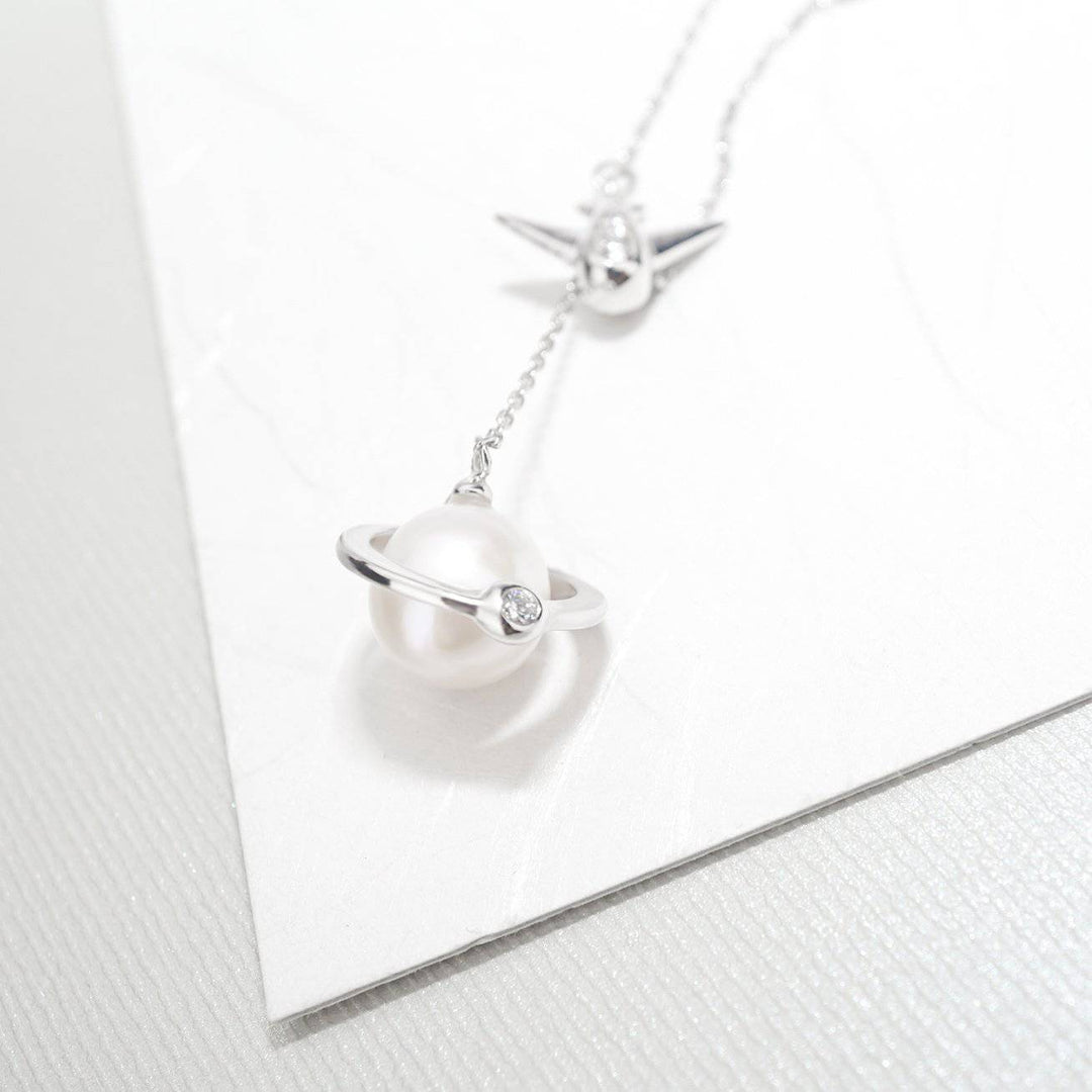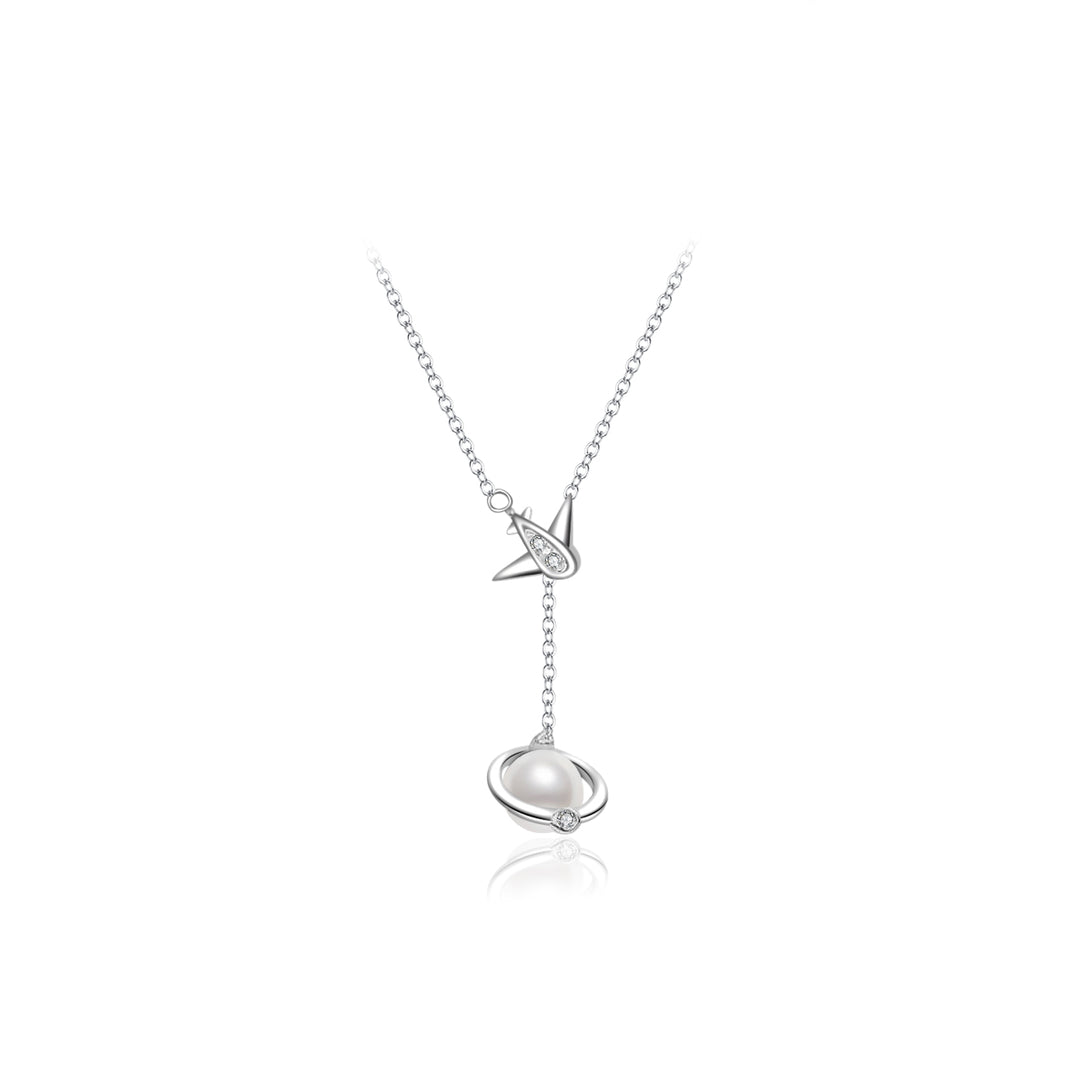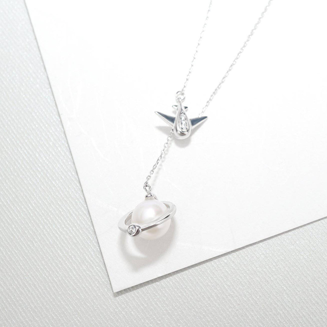 هذه قلادة اللؤلؤ الرائعة مخصصة للمرأة التي على وشك الانطلاق في مغامرة، لاستكشاف العالم، ورؤية العالم، ومقابلة أشخاص جدد. نحن نحب الطائرة، مع لؤلؤة تحتها تمثل العالم عند قدميها. زركون مكعب، لؤلؤة، وفضة استرلينية.