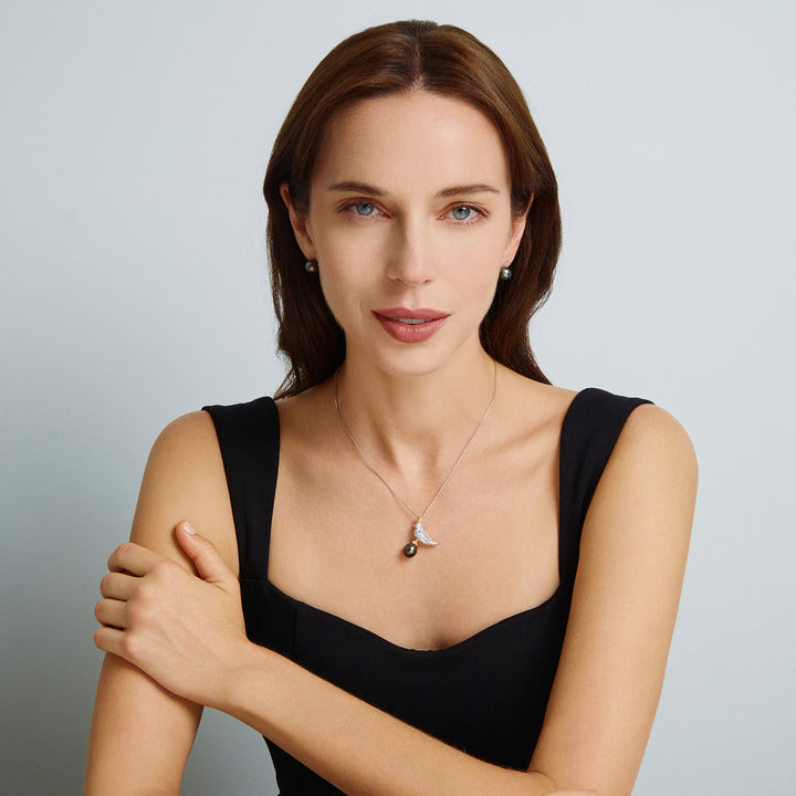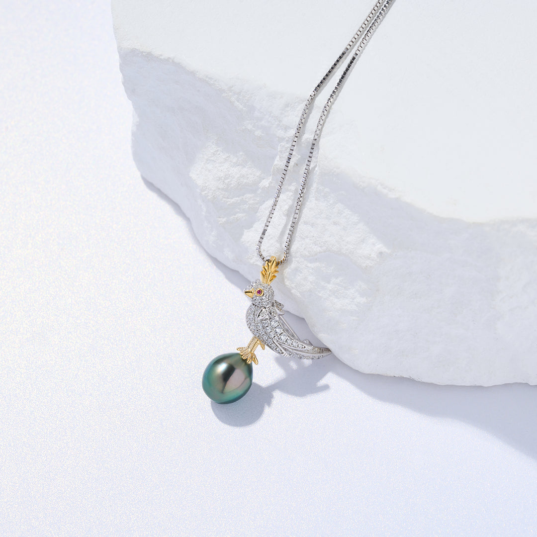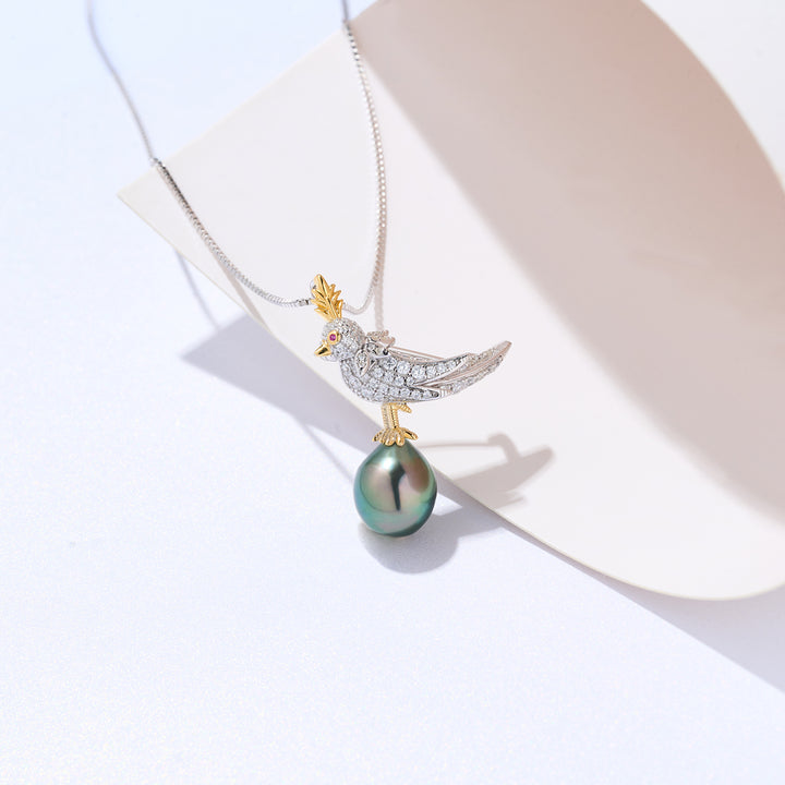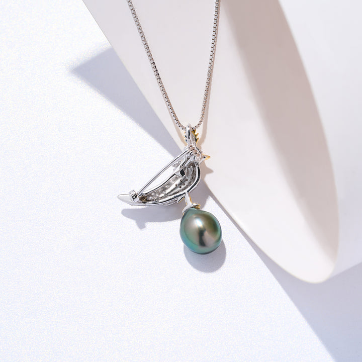 مستوحاة من طائر التوراك الأزرق العظيم من حديقة الطيور في سنغافورة، هذه دبوس اللؤلؤ والقلادة المتعددة الاستخدامات تتميز بلؤلؤة تاهيتي لافتة للنظر. دبوس عصري أو مجوهرات لؤلؤة تاهيتي بارزة، مثالي للنساء اللواتي يبحثن عن أناقة فريدة أو الرجال الذين يضيفون لمسة من الرقي إلى البدلات.