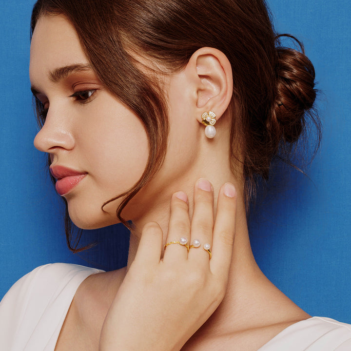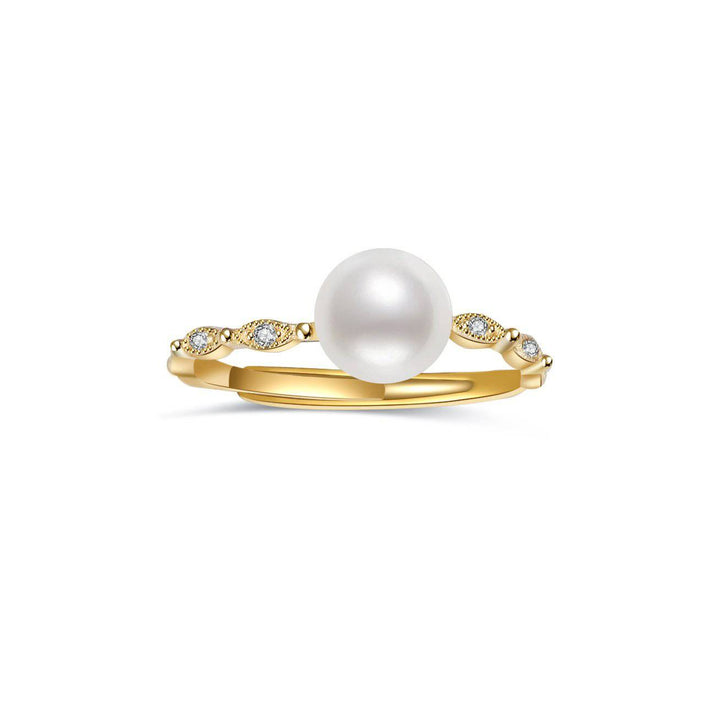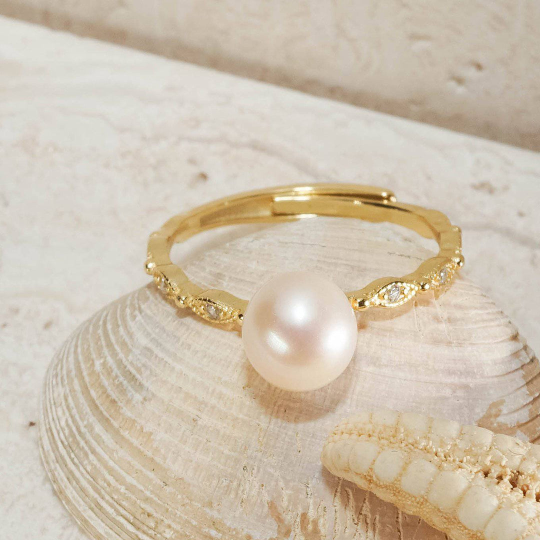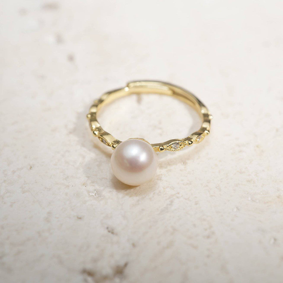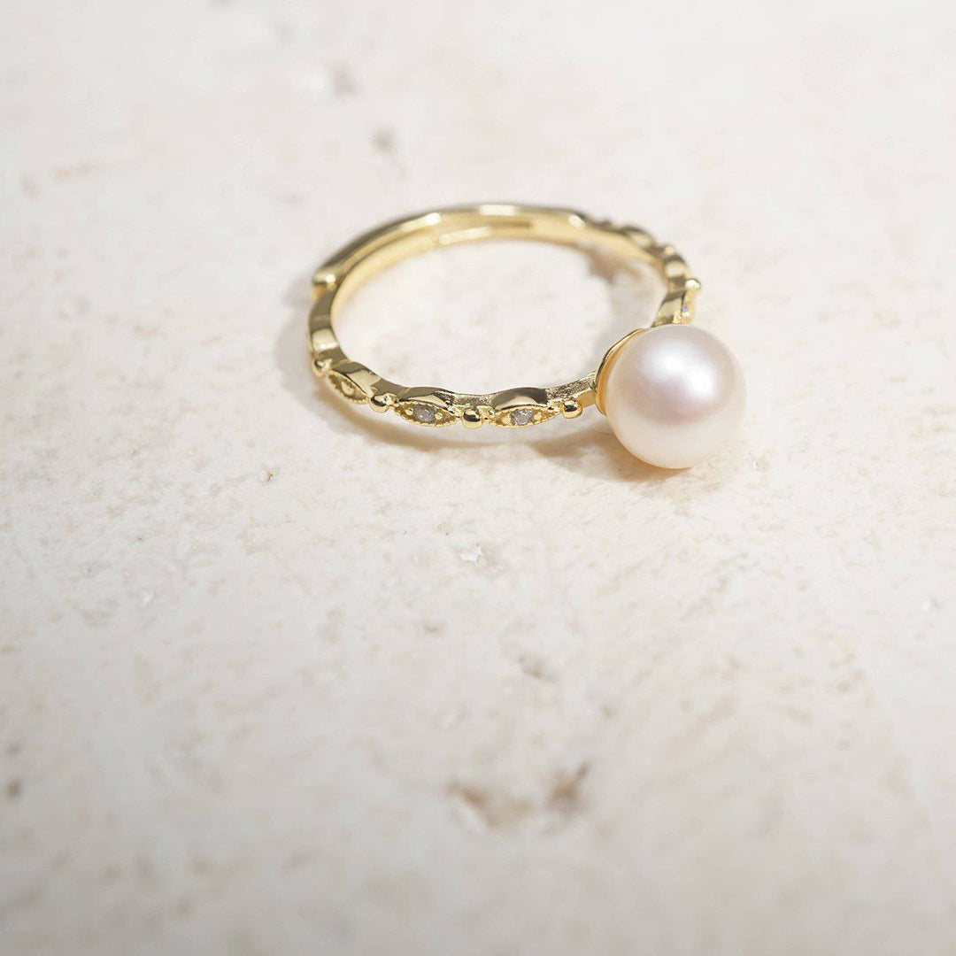 خاتم ذهبي أنيق مرصع بالزركونيا المكعبة مع لؤلؤة واحدة.  تتميز هذه القطعة الذهبية بأنها أنيقة ومناسبة، وتشع أناقة ورشاقة من يرتديها. هذه اللآلئ الجميلة ستجعلك تبدو أقرب إلى الملوك. خاتم بسيط وأنيق مثالي للخروج في موعد بسيط، مع فستان أنيق.