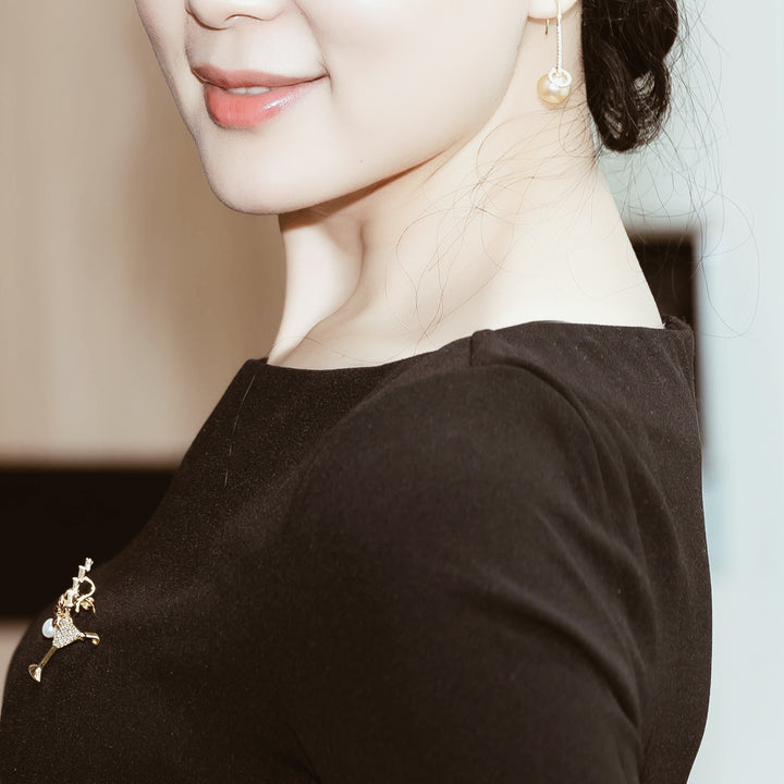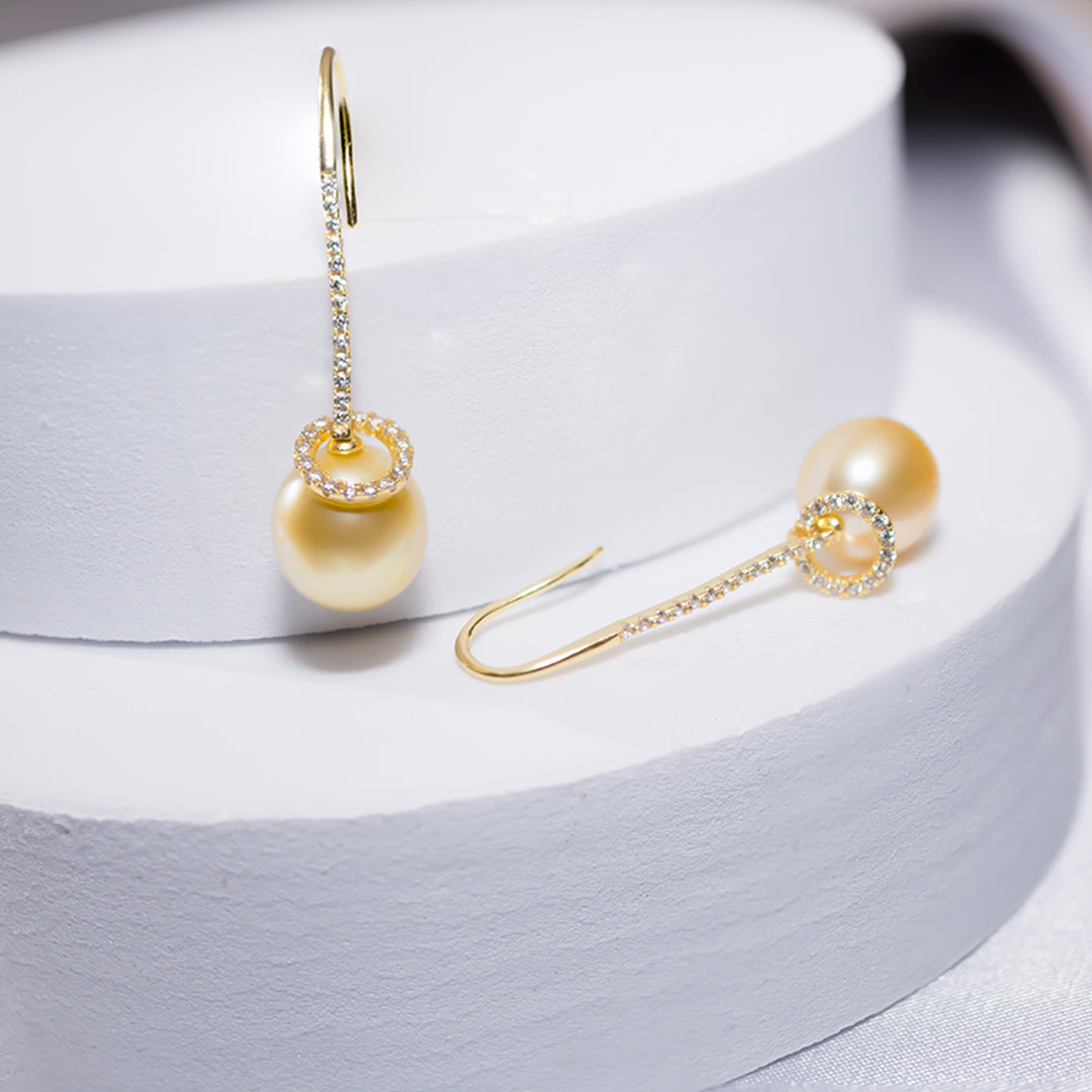 Funkelnde Perlenohrringe, Zirkonia und atemberaubende goldene Salzwasserperle . Festlich, raffiniert und perfekt für einen feierlichen Anlass. Tragen Sie sie und zeigen Sie Ihre Klasse!