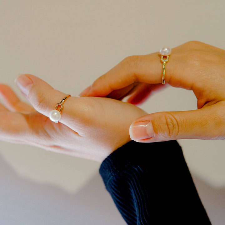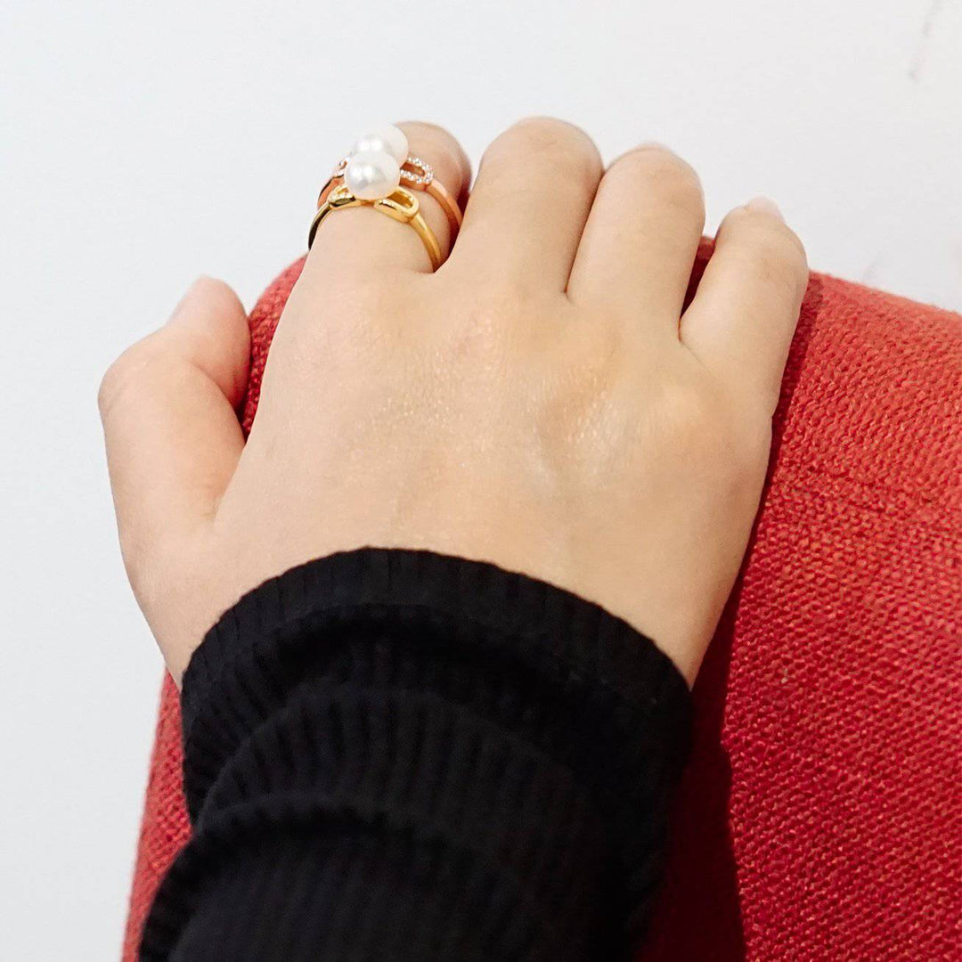 Dies ist ein Perlenring für die abenteuerlustige Frau, die sich auf eine Reise begibt, bei einem besonderen Abendessen feiert und die Welt vor sich erkundet. Ein Süßwasserperle in einem atemberaubenden ovalen Design, mit Zirkonia auf einer Seite und vergoldetem Sterlingsilber auf der anderen für zusätzlichen Glanz!