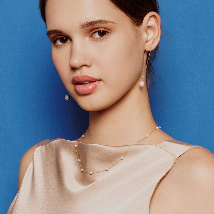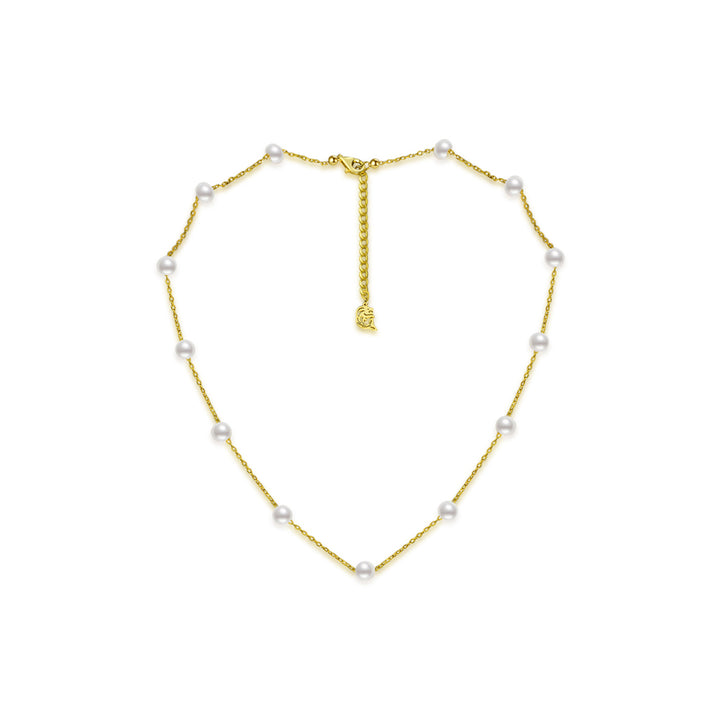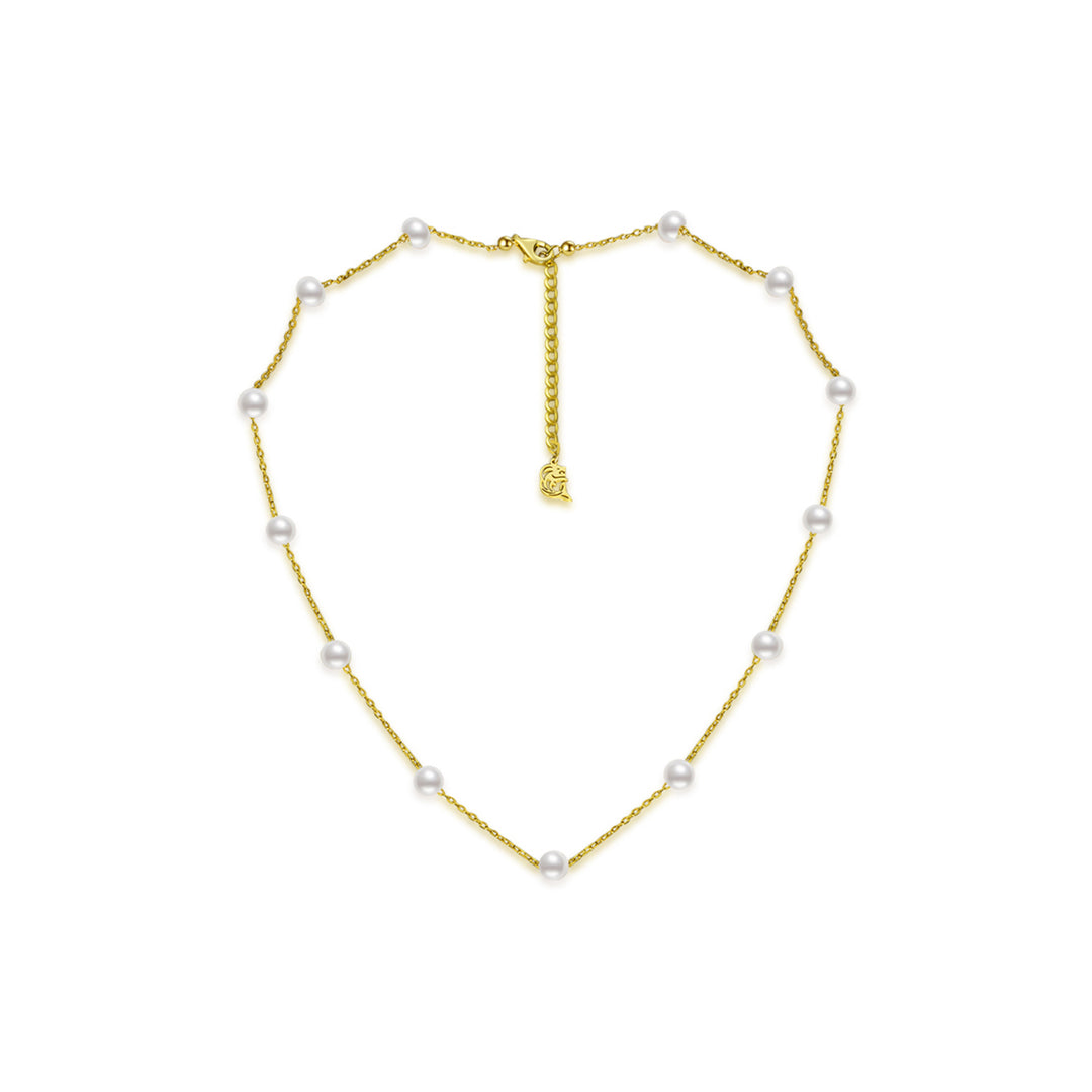 Verstreute Perlen, eingebettet in eine klassische Goldkette, sorgen für einen vielseitigen, anmutigen und dennoch trendigen Look. Perfekt fürs Büro oder zum Ausgehen.