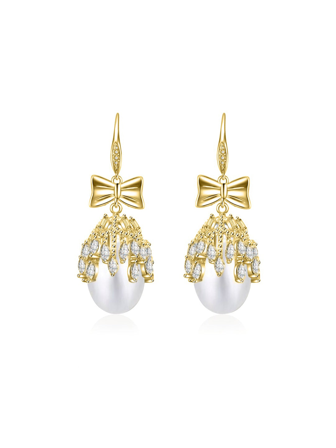 Glänzen Sie durch die Nacht mit diesen eleganten Ohrringen, die bei jeder Hochzeit oder Abendgesellschaft ein Blickfang sind. Auf jeder Seite eine einzelne Süßwasserperle, reichlich umgeben von silbernen Zirkoniasteinen, gekrönt von einer feinen Schleife.