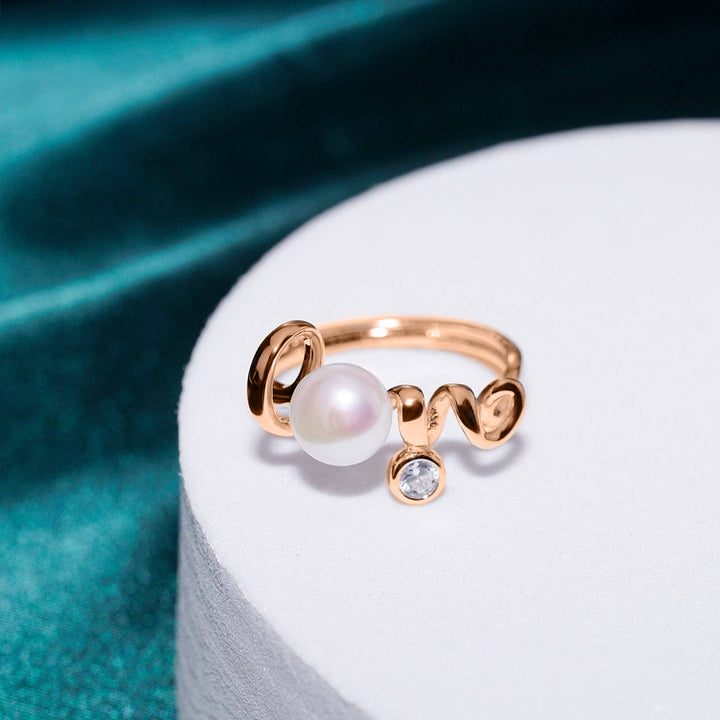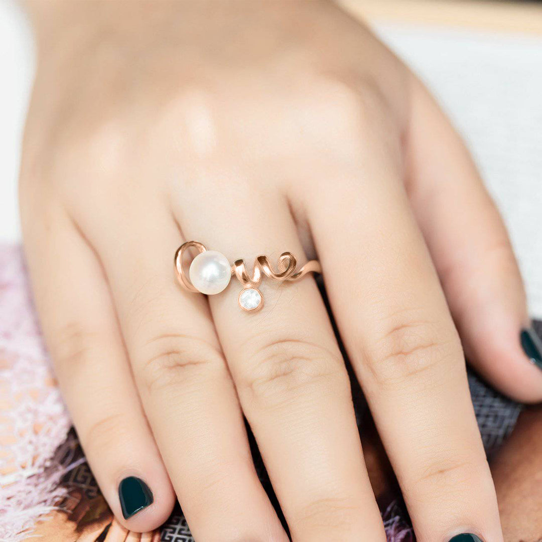 Ein einzigartiger und zeitgemäßer Liebesbrief-Perlenring. Die Designer dieses Rings haben sich besonders bemüht, einen Ring zu schaffen, der Liebe, Glamour und Stil andeutet. Wir lieben die silberne Drehung, das Glitzern der Zirkonia und die elegante Süßwasserperle. Es ist ein Liebesbrief, für dich!  Sag ihr, dass du sie liebst, mit diesem Perlenring.