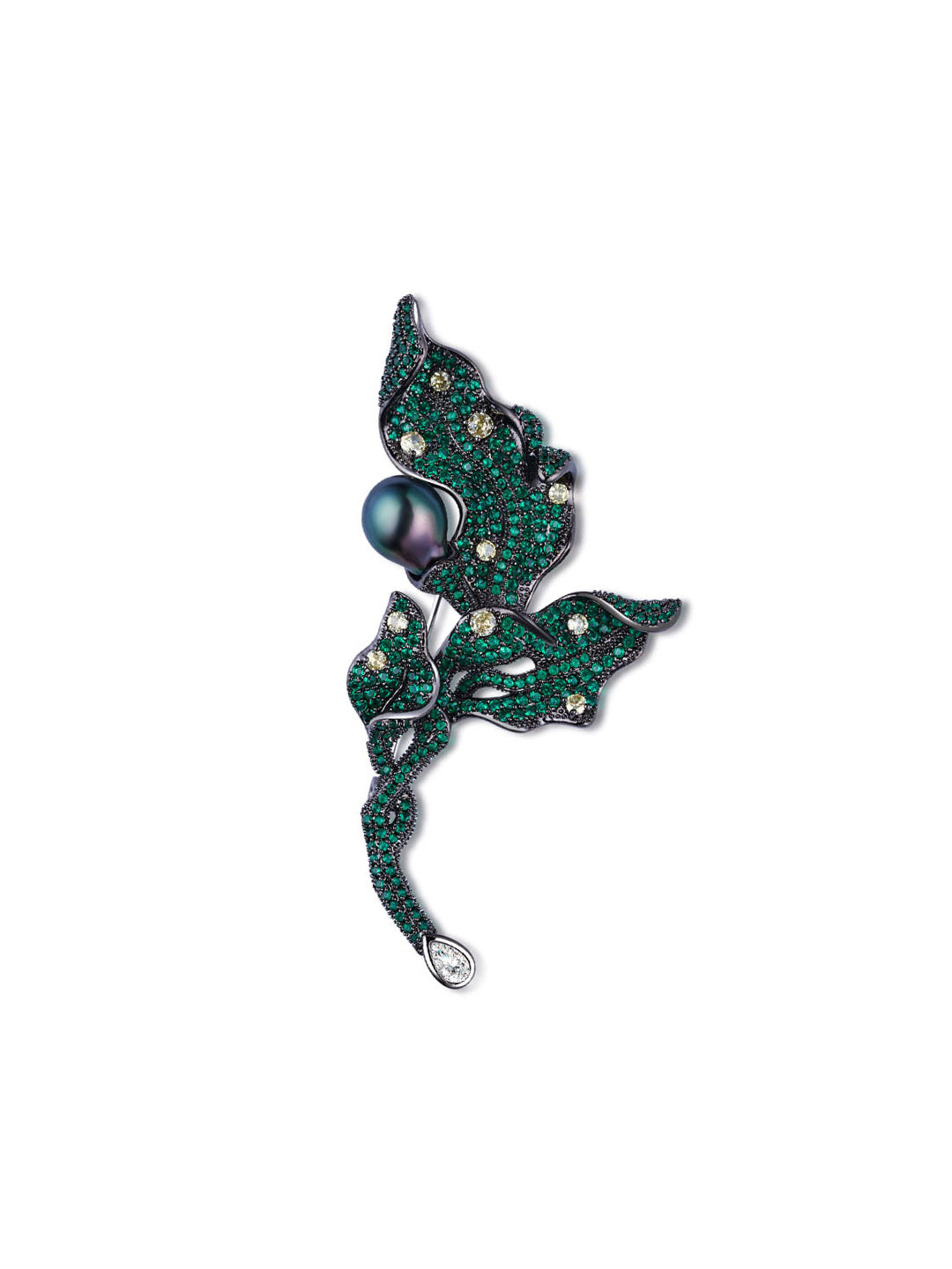 Eine künstlerische Brosche, die die Schönheit der Natur in Ihre Kleidung bringt, wunderschön betont mit einer Tahiti-Perle – geheimnisvoll, elegant und voller Geschmack.