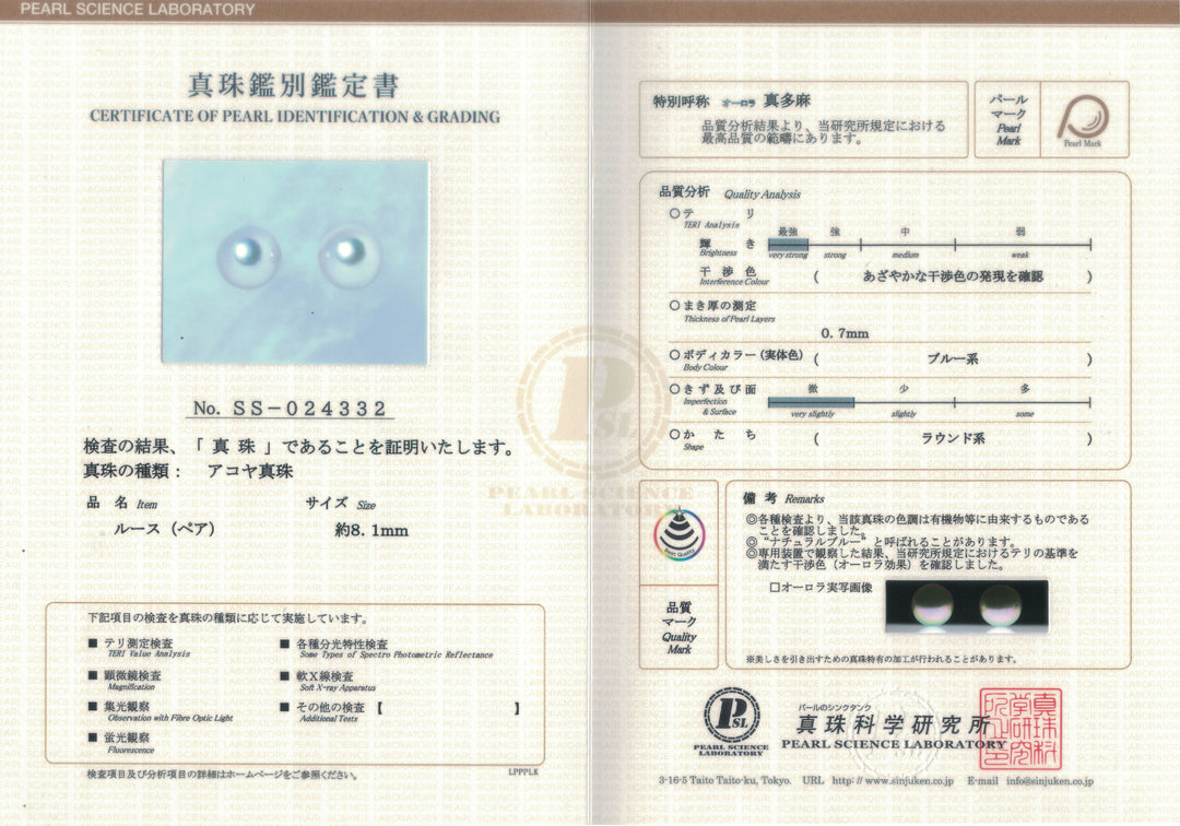 Gemological Institute of America or Pearl Science Laboratory Japan pearl identification examination