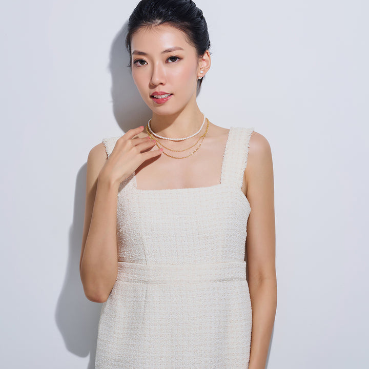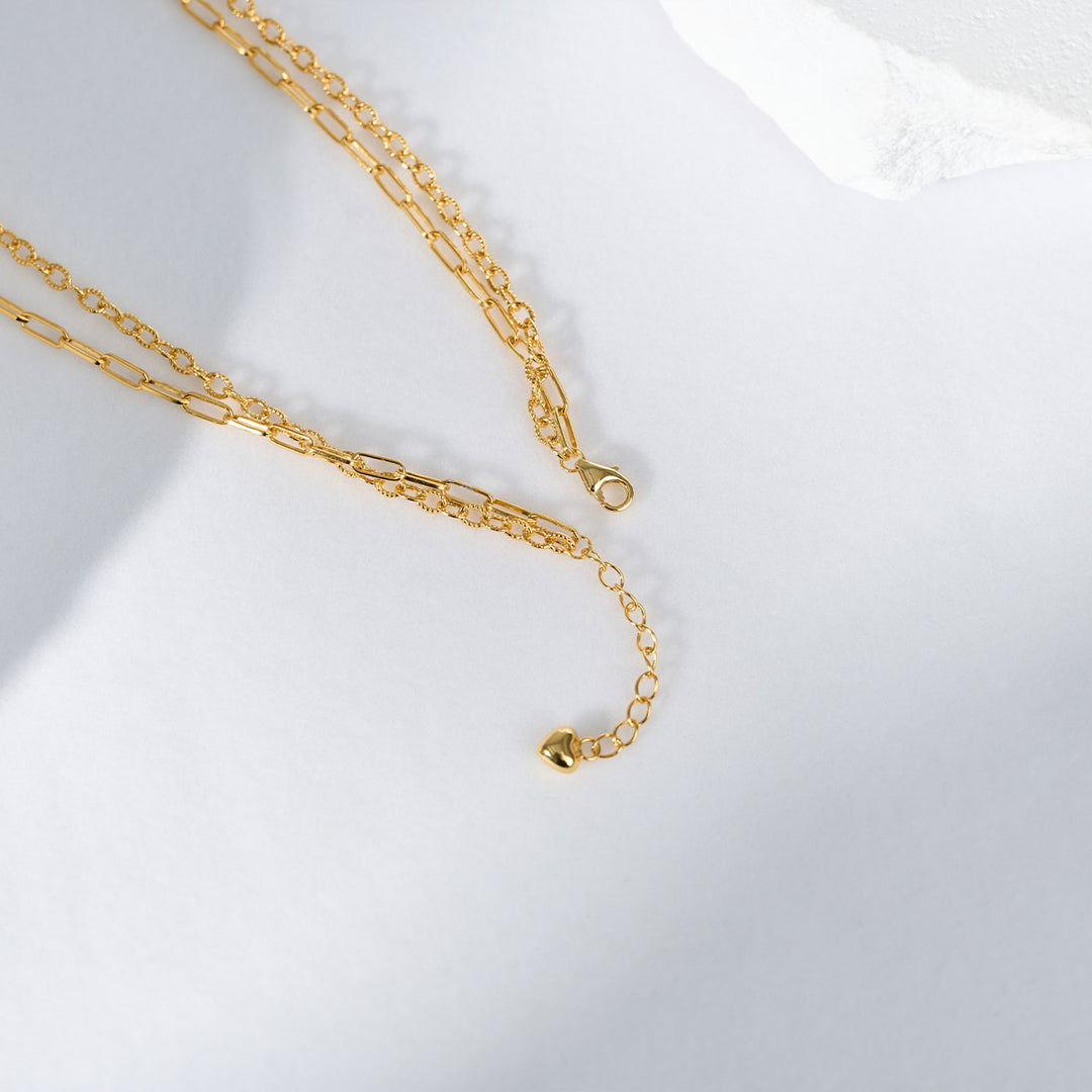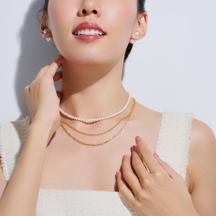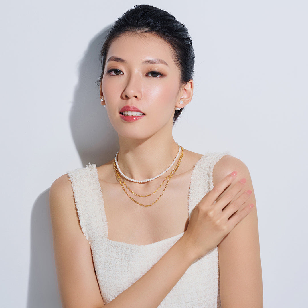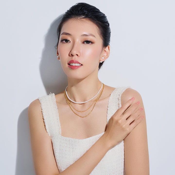 The double chain necklace offers endless styling possibilities — wear it solo for a sleek look, layer it with a single pearl necklace, or add a pendant for extra charm. Timeless and versatile, it effortlessly blends modern fashion with the elegance of pearls.