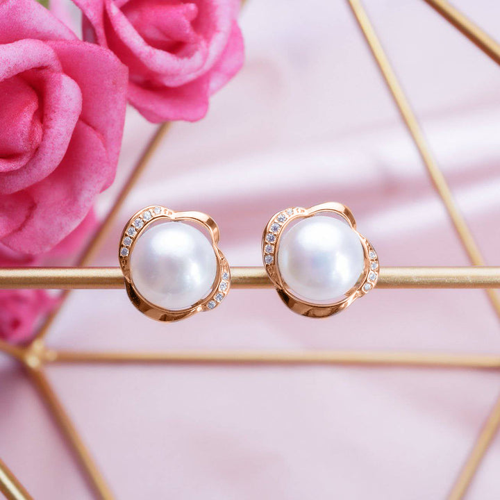 Simple, extremely stylish and graceful, these pearl stud earrings show class, elegance, and beauty. A twist added with cubic zirconia flowery crafting at two sides.