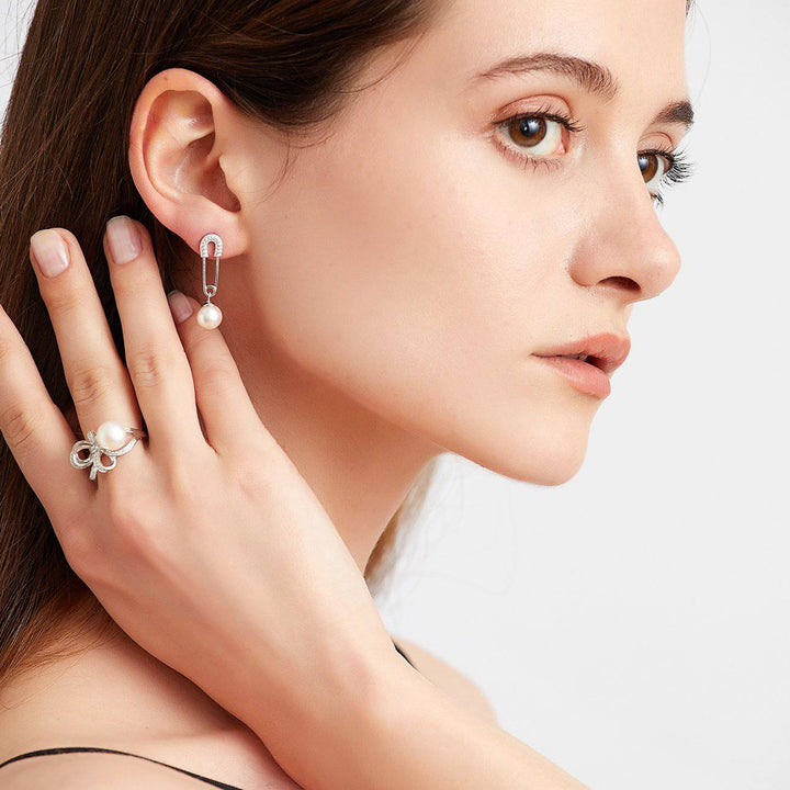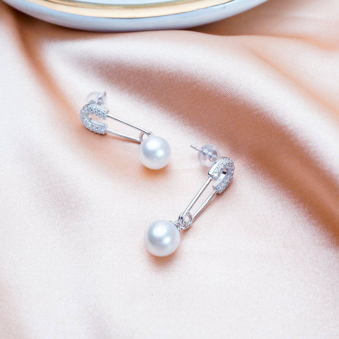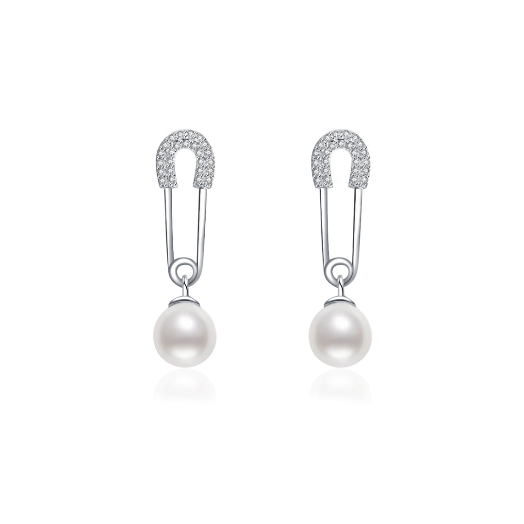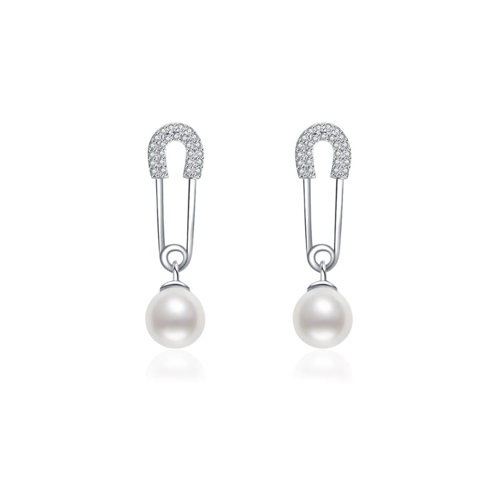 Candied pins hold tightly onto unique bold white pearls.  Inspired by the exclusive, bold safety pin trend. Our designers wove the unique design of a safety pin into a bold white pearl. This strong and elusive piece would look stunning with a bold blouse on a workday to elude strength and confidence in style.