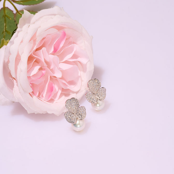 What a stunning pair of earrings these are, pearl earrings specially designed for the woman with grace and sophistication. The freshwater pearl sits amidst petals of cubic zirconia and sterling silver, luxurious, lovely and loving.