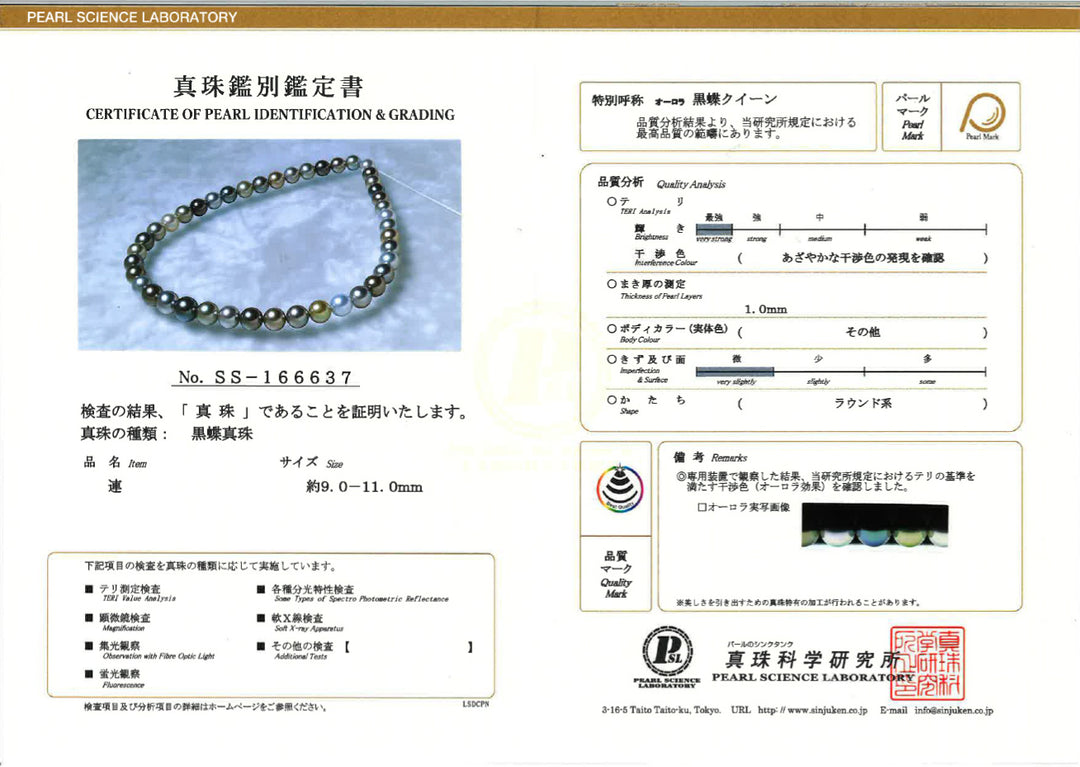 Aurora Queen represents the best quality Tahitian pearl strand certified by Japan Science Laboratory. International certification number SS-166637.