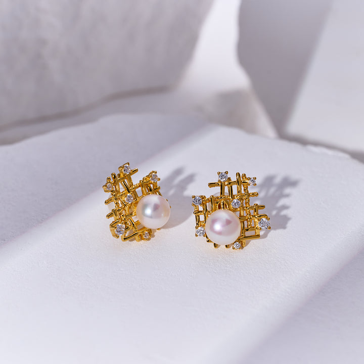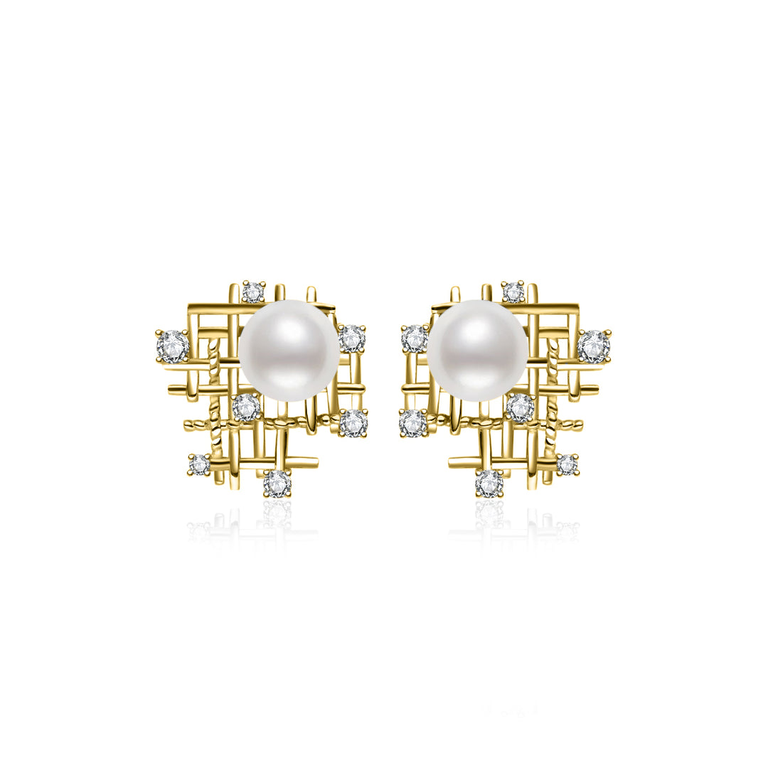 Una sola perla de agua dulce anidada en un waffle dorado, espolvoreado con cubic transparente. Las cuadrículas simétricas del postre waffle inspiran este par audaz y único de pendientes de perla. Simple, pero único y elegante, este par de pendientes se vería hermoso con un par de jeans elegantes y una blusa blanca en un día casual.