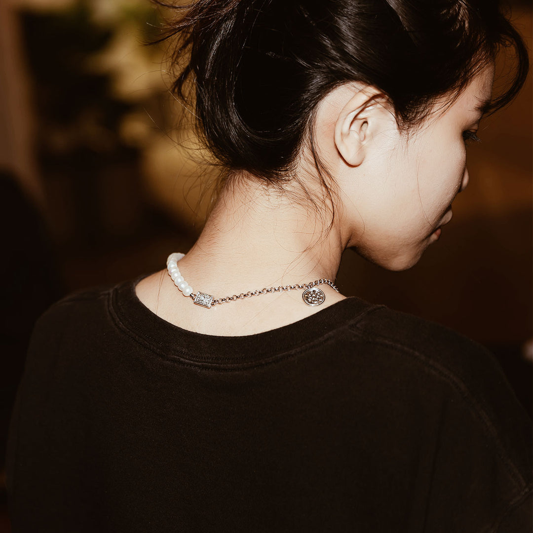 Este collar de perlas está inspirado en el dokoh con un toque de perlas y plata. Cada dije simboliza buena suerte.