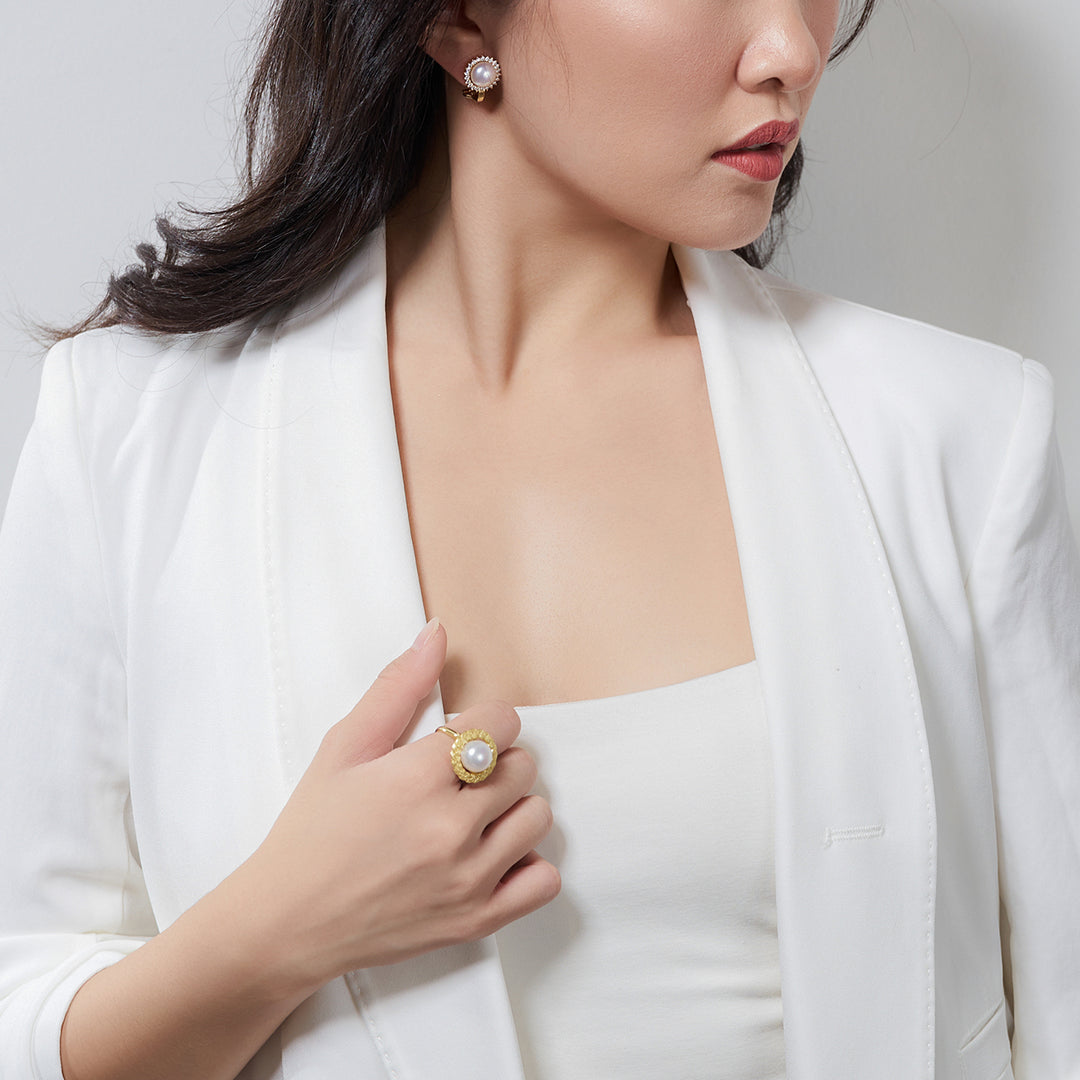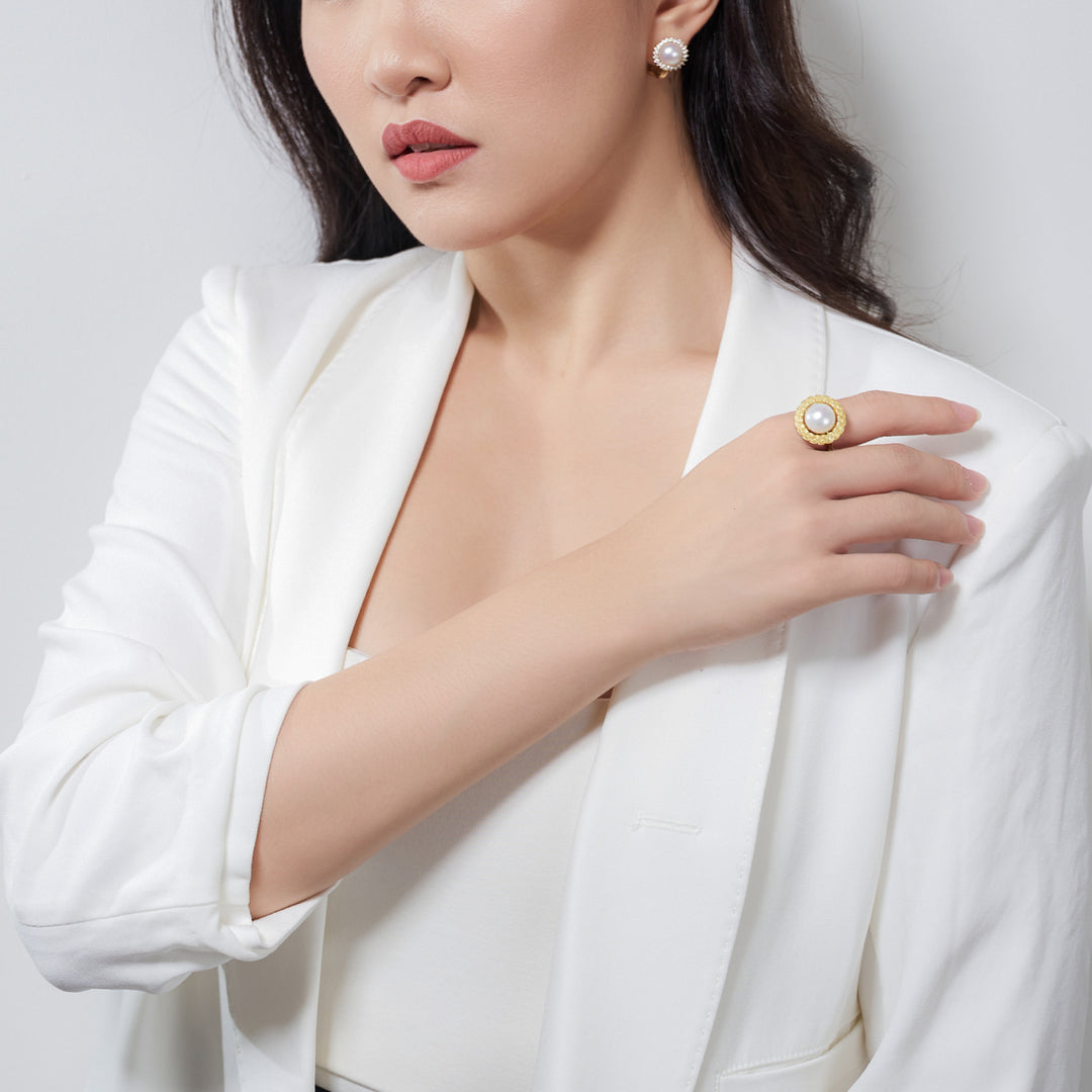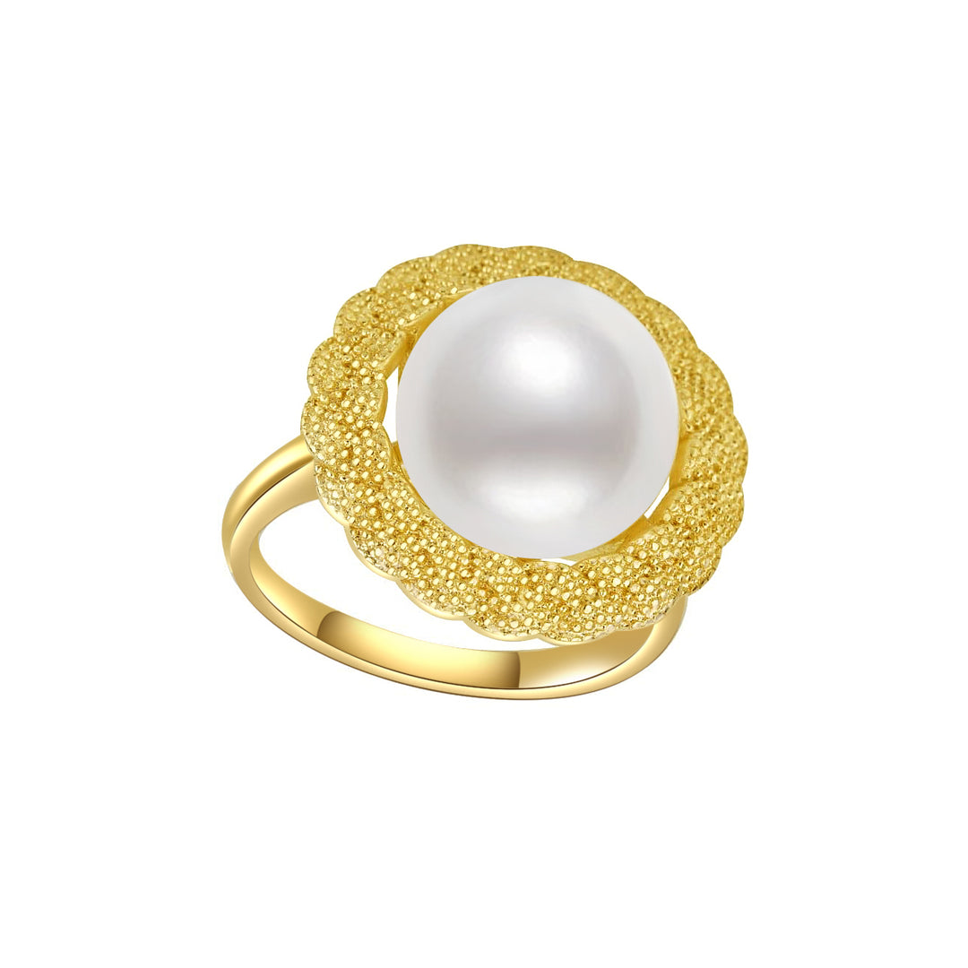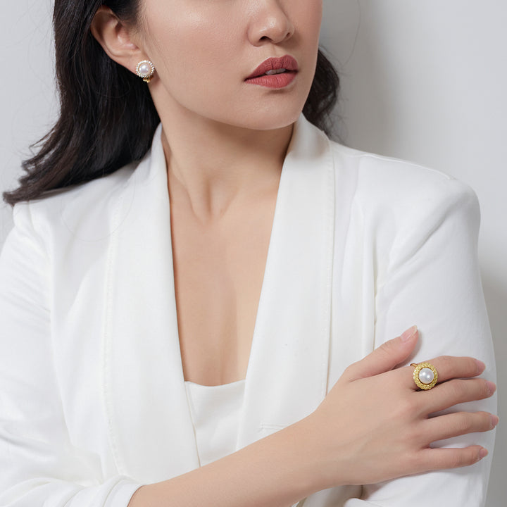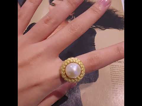 Design unique, perle exquise entourée de filigrane en or, détail complexe, une bague en perle pour la femme avec flair, style et beauté.