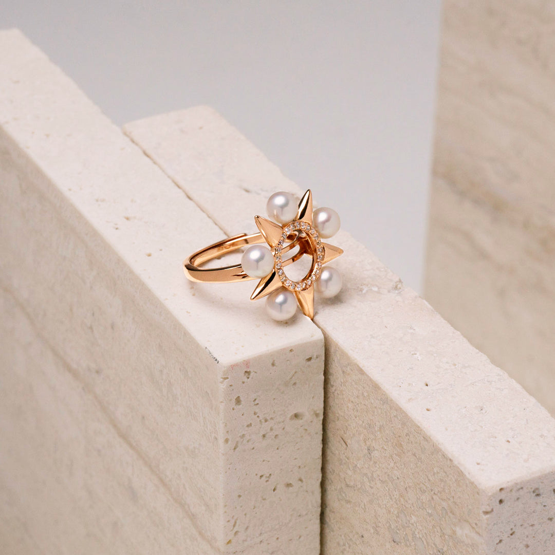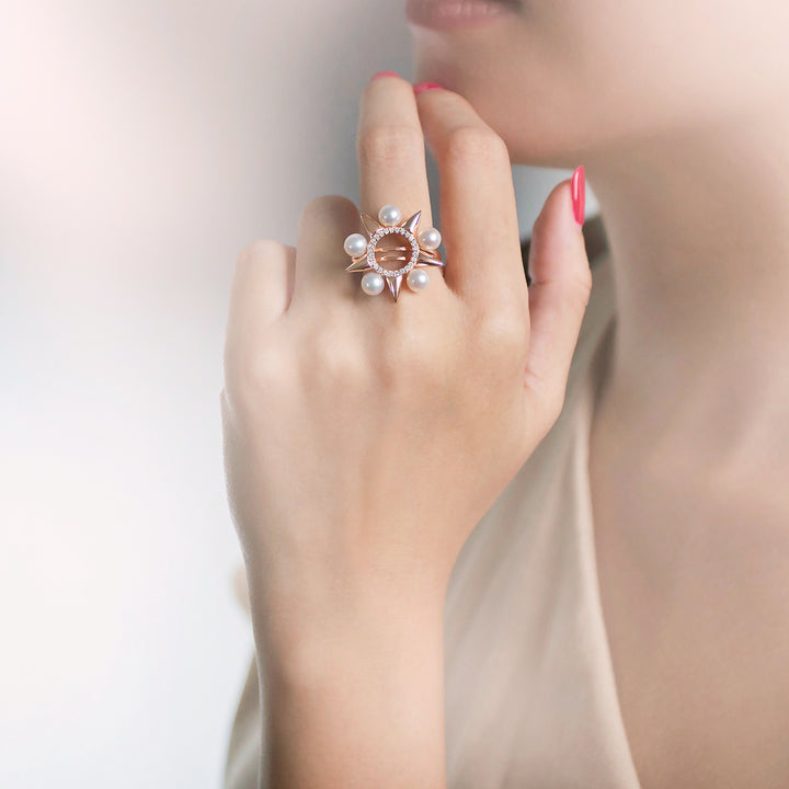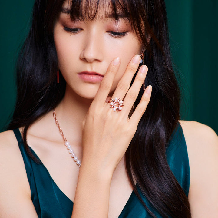 Cette bague en perles est moulée en argent sterling en forme d'étoile scintillante, habilement équipée de cinq perles brillantes, portez-les comme votre signature quotidienne.