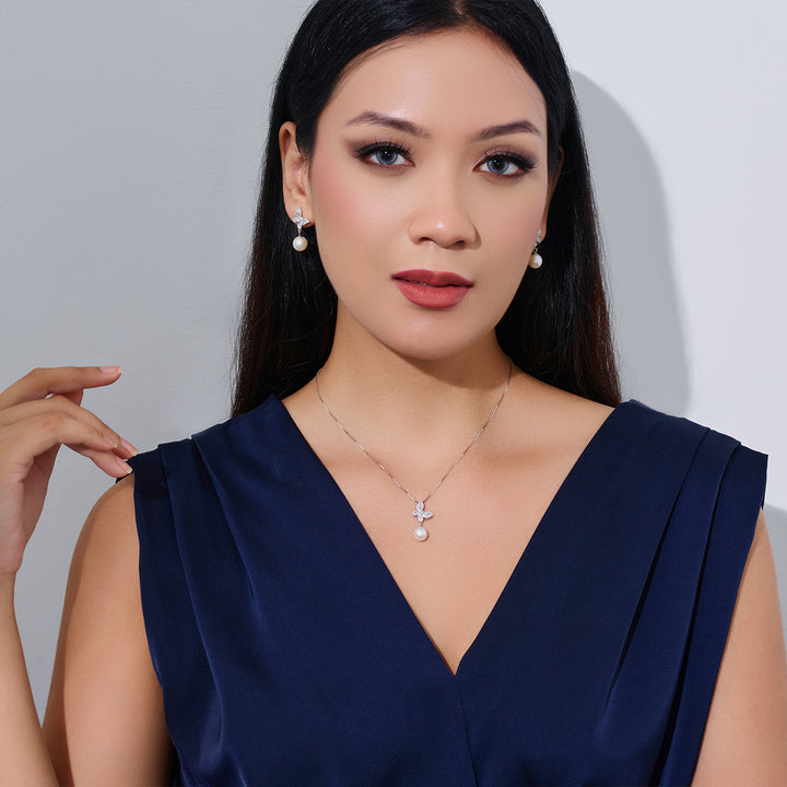 Le papillon de la forêt rencontre une perle d'eau douce. Cet ensemble capture les papillons dans les jardins luxueux qui relient l'océan et les rivières de manière si harmonieuse, que c'est presque magique. Une belle robe blanche fluide avec ce collier de perles papillon fera l'affaire