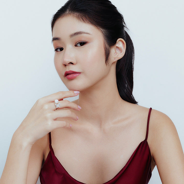 Le papillon de la forêt rencontre une perle d'eau douce. Cette pièce capture les papillons dans les jardins luxueux qui relient l'océan et les rivières de manière si harmonieuse, que c'est presque magique. Une belle robe blanche fluide avec cette bague papillon en perle fera l'affaire !