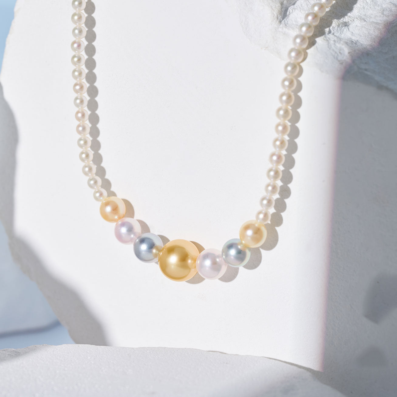 Découvrez une fusion éblouissante de tons blanc akoya, bleu argenté et or. Parfaitement équilibrée, cette collection unique est un incontournable pour les amateurs de perles, promettant d'être la pièce maîtresse de votre collection.