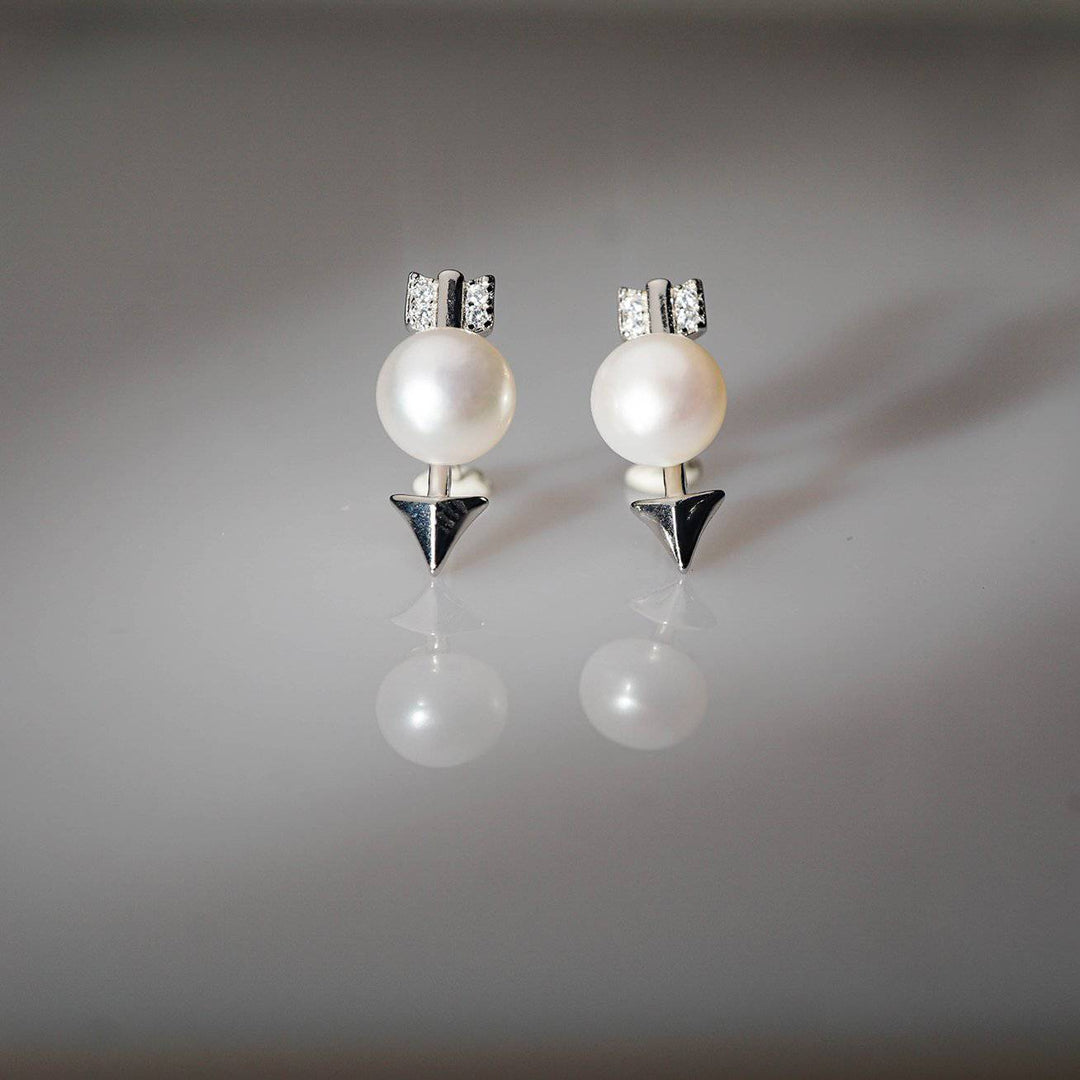 Une flèche ferme perce une seule perle fraîche et solitaire, symbolisant l’amour. Un design contemporain inspiré des célèbres œuvres littéraires grecques de Cupidon, connu pour l'image d'un cœur percé d'une seule flèche comme symbole de l'amour. Cette paire de boucles d'oreilles intemporelles aurait l'air tendance lors d'un rendez-vous, associée à une robe romantique.