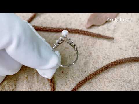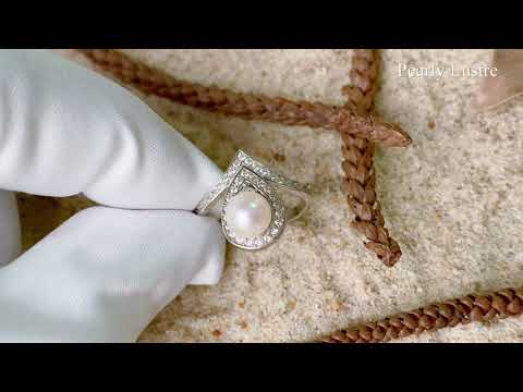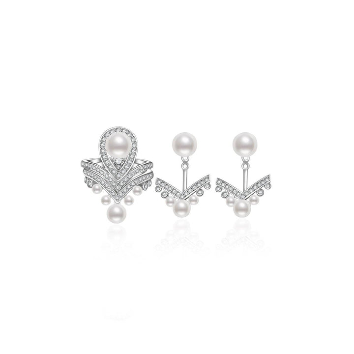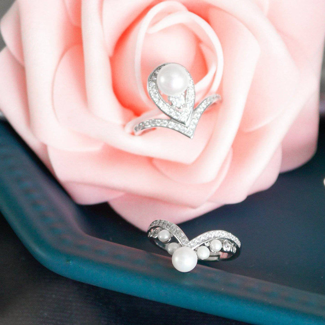 Une paire de boucles d'oreilles charmantes s'associe à deux bagues en perles qui ne font qu'un ; elles sont comme une tiara au doigt. L'une est en forme de cœur, l'autre ressemble à un diamant. Bijoux scintillants et sexy ornés d'une élégante perle d'eau douce et de zircon cubique. Chacune peut être portée seule ou ensemble. Ensemble de bijoux en perles rêveur et romantique pour un usage quotidien ou des fêtes, également adapté pour les mariages.