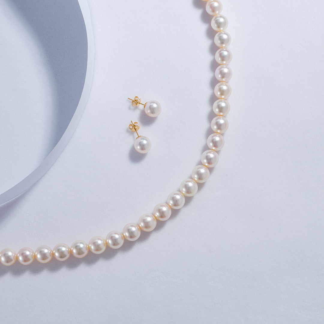 Cet ensemble de perles Akoya est soigneusement assorti en taille et en couleur. Collier en perles d'or 18 carats avec boucles d'oreilles assorties à la bonne taille pour mettre en valeur votre beauté. Sophistiqué, chic et classique. Un ensemble de bijoux en perles Akoya spécialement pour elle.