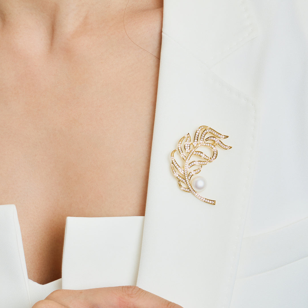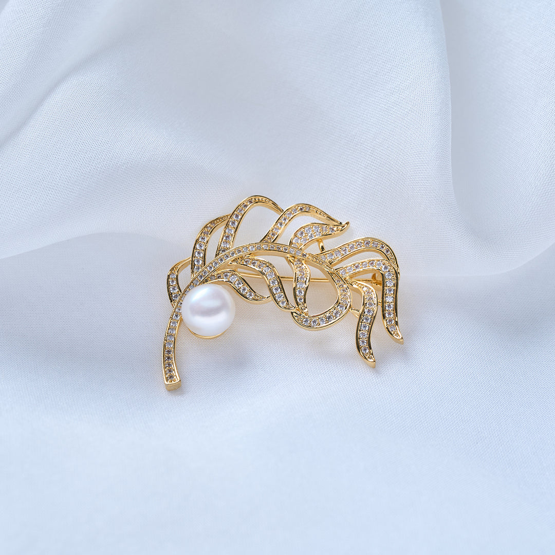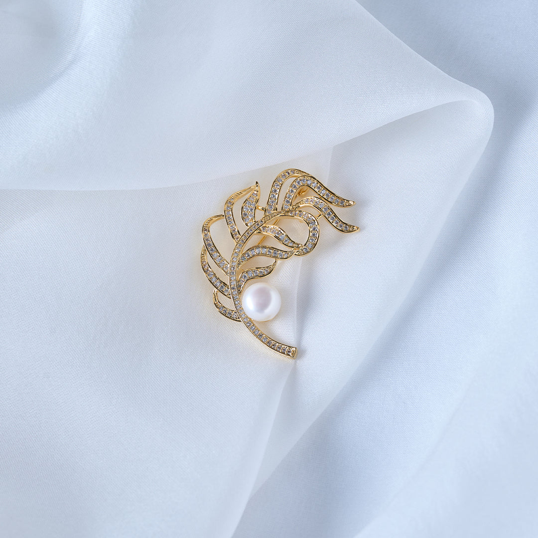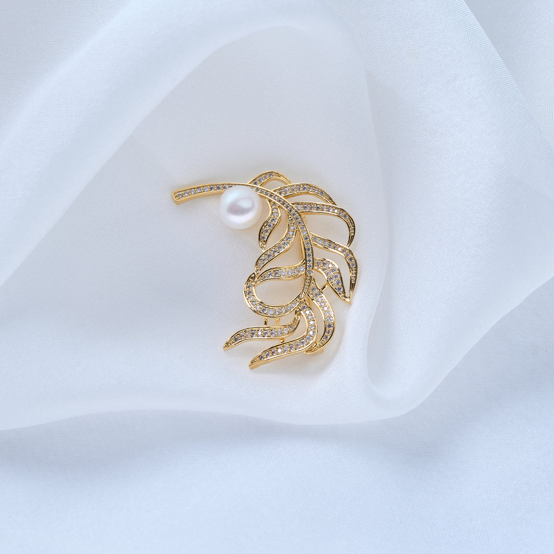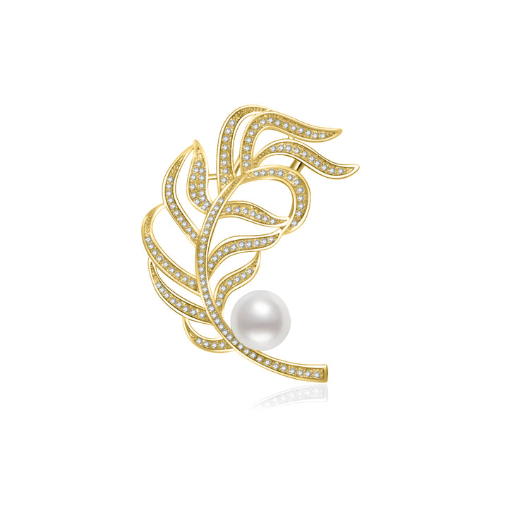 Caratterizzato da un design decorativo a piuma, questa spilla è la soluzione perfetta per aggiungere un tocco di bellezza naturale al tuo outfit. È realizzata con perle d'acqua dolce da 9-10 mm Freshwater Pearls con Cubic Zirconia che aggiunge più brillantezza al pezzo.