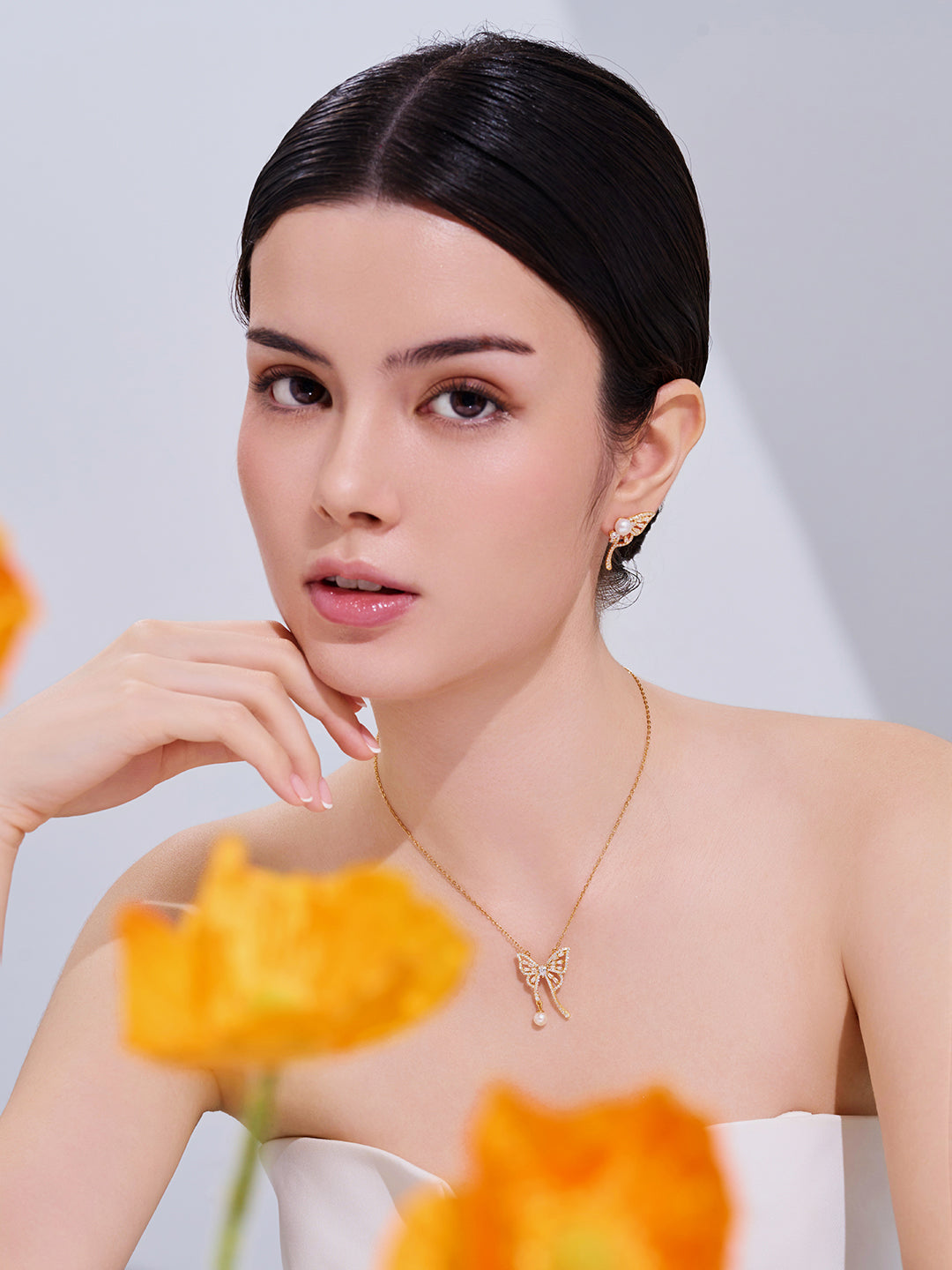 La farfalla della foresta incontra una perla d'acqua dolce. Questo set cattura le farfalle nei giardini lussuosi che collegano con l'incantevole oceano e i fiumi in modo così armonioso da sembrare quasi magico. Un bellissimo abito bianco fluente con questa collana di perle a forma di farfalla farà al caso tuo