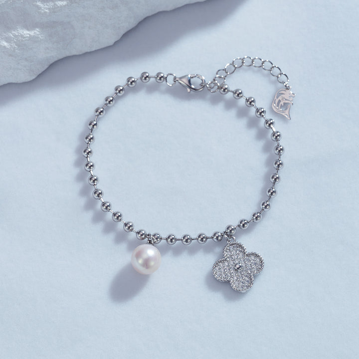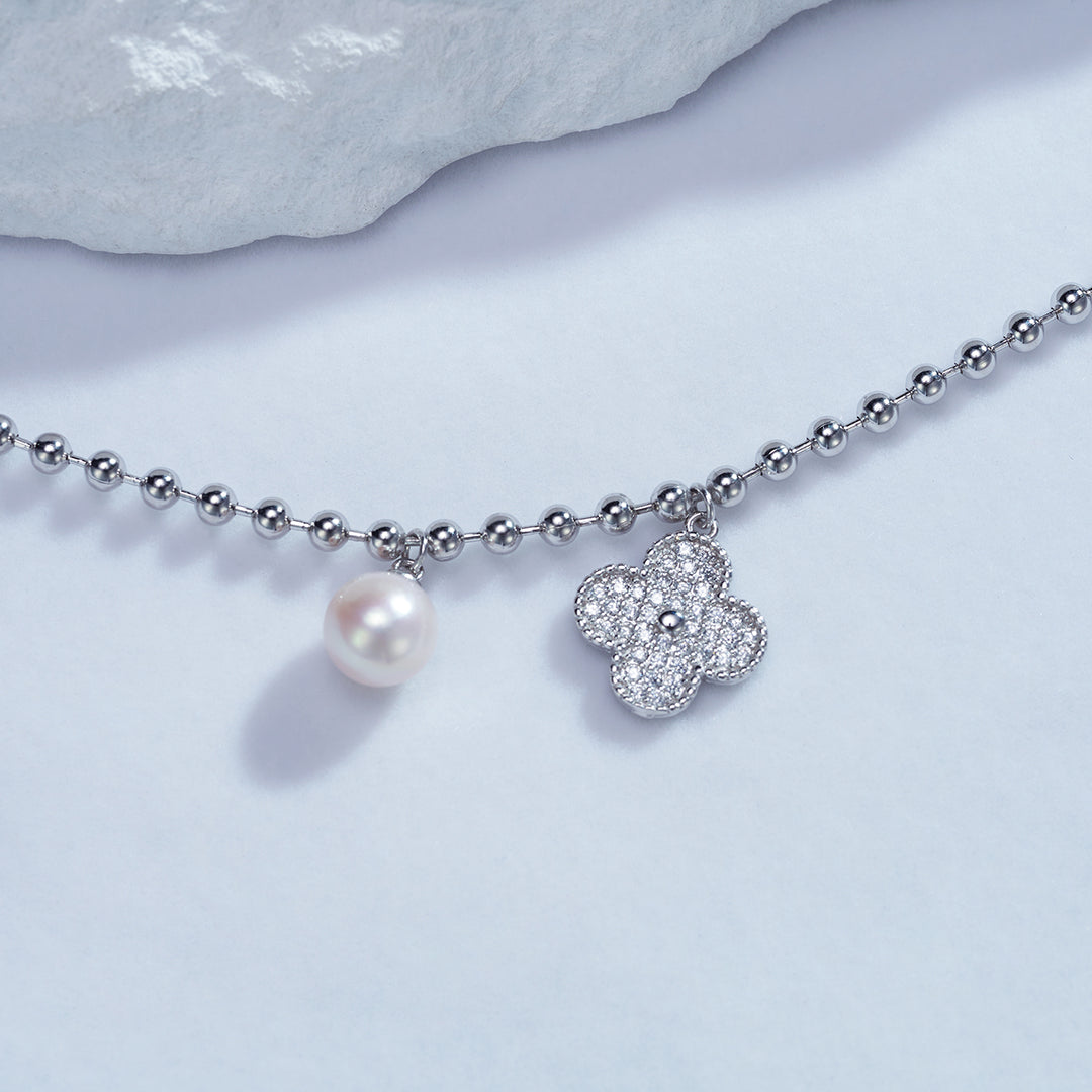 Aggiungi fascino al tuo stile con questo trendy bracciale in perle d'acqua dolce. Caratterizzato da una catena a pallini in argento, una delicata perla e un charm a forma di fiore candito, è l'accessorio perfetto per donne eleganti in cerca di gioielli in perle d'acqua dolce chic e moderni gioielli in perle.