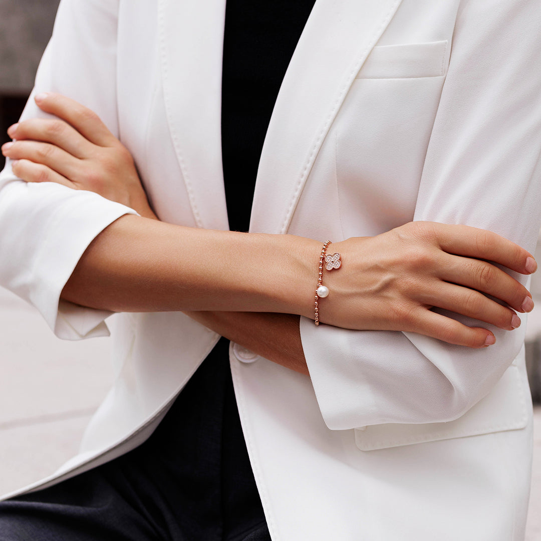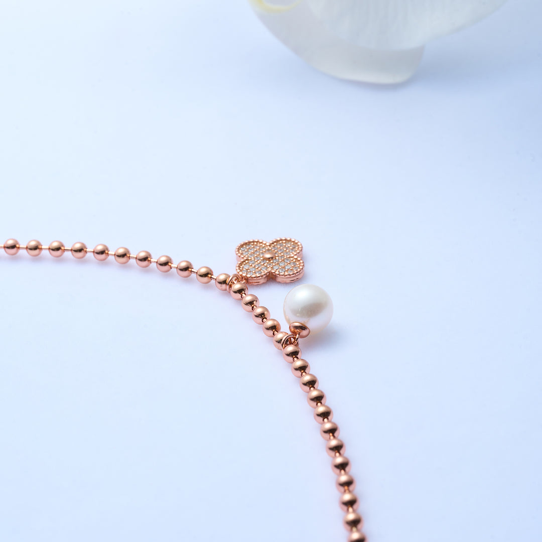 Un braccialetto con catena a sfere in oro rosa con una perla fresca e un ciondolo a forma di fiore candito attaccato. Viene fornito con una catena di estensione unica ed elegante. Accessorio in oro rosa perfetto per le tonalità della pelle fredde. Specialmente per graziosi picnic con gli amici con un vestito scozzese alla moda.