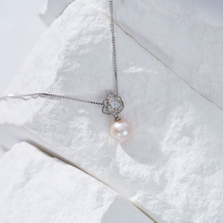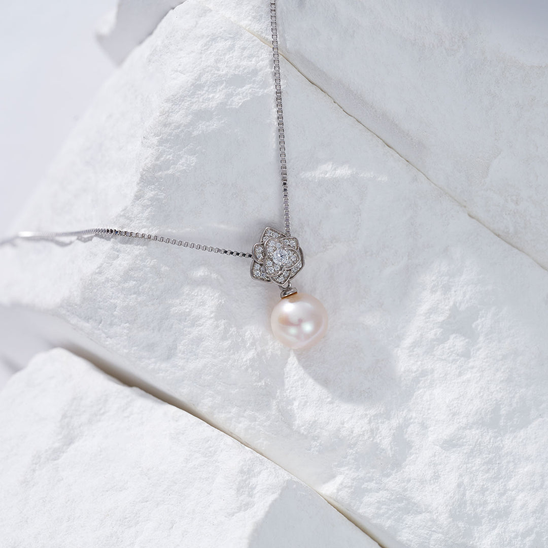 La graziosa e composta rosa candita si trova sopra una singola perla d'acqua dolce trasparente. Abbinata a una perla d'acqua dolce impeccabile, questo pezzo evoca glamour e sofisticatezza che non puoi perdere. Incantevole con un meraviglioso vestito fluido.