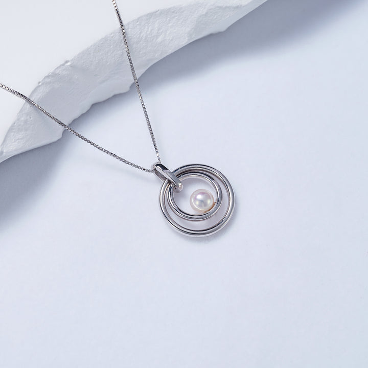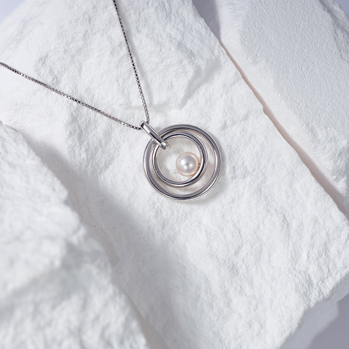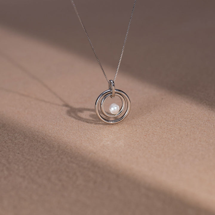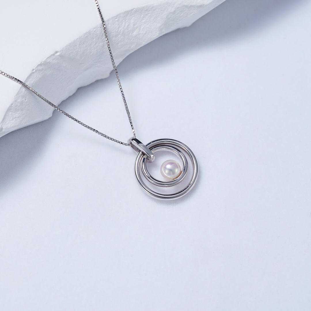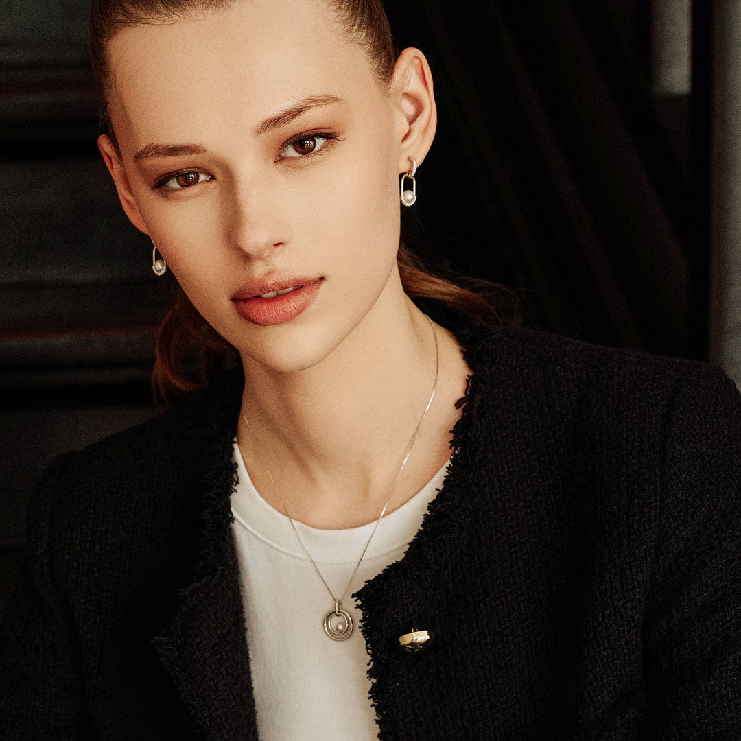 Collezione Connect, due cerchi intrecciati, le perle danzano con ogni movimento di chi le indossa, incarnando l'armonia di una famiglia completa.