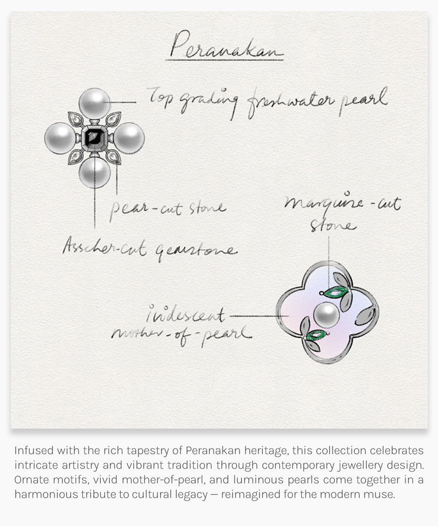 Ispirati dal patrimonio Peranakan con un tocco di chic parigino, questi orecchini fondono motivi intricati con un'eleganza senza tempo. Delicati ma audaci, catturano lo spirito vibrante della tradizione e del lusso moderno, rendendoli una dichiarazione perfetta di fusione culturale e sofisticatezza.
