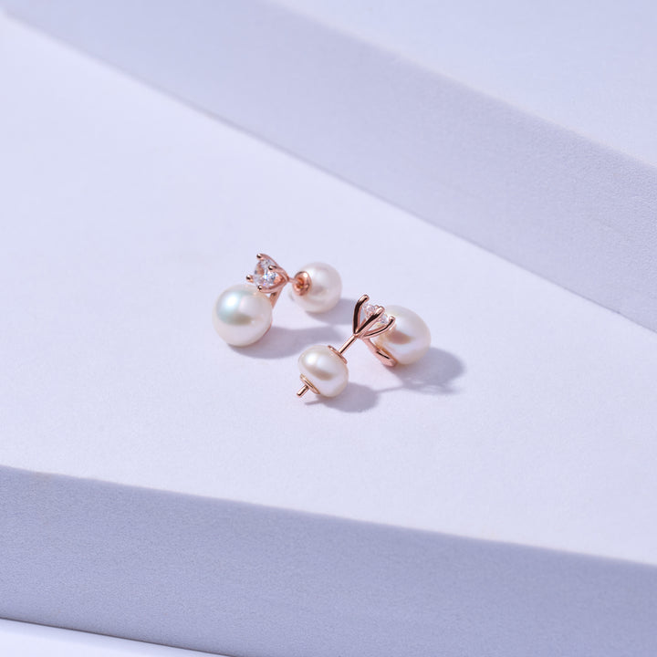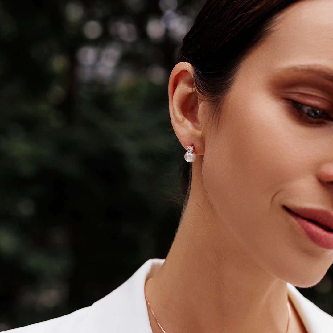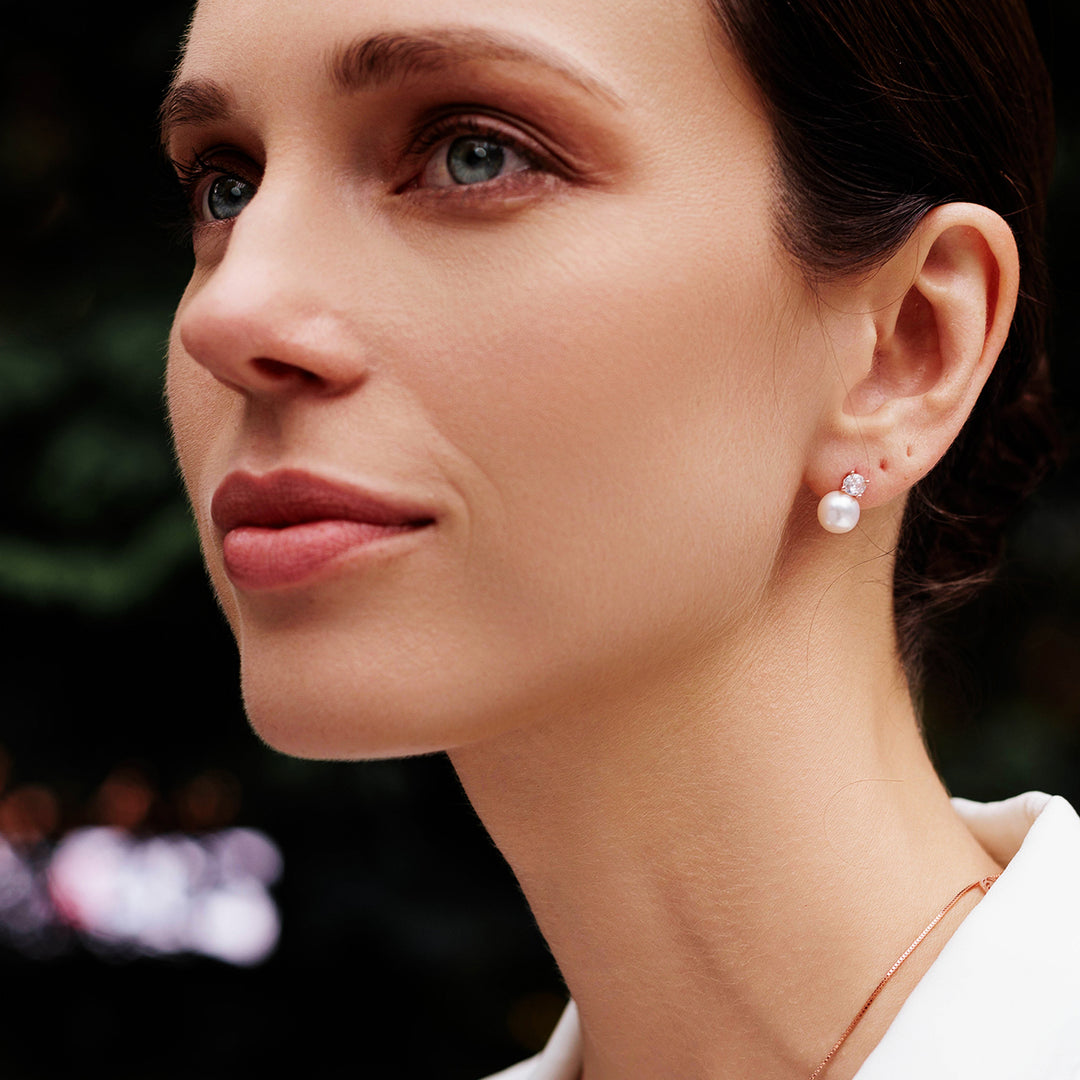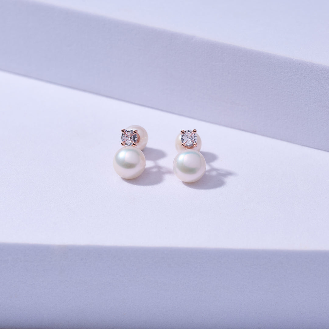 このパールのイヤリングは、とてもスタイリッシュです。光沢のある淡水パールで飾られた、ちょうど良いサイズのキュービック ジルコニアを 1 個、クラシックかつグラマラスなスタッド イヤリングにセットしました。洗練された女性へ。
