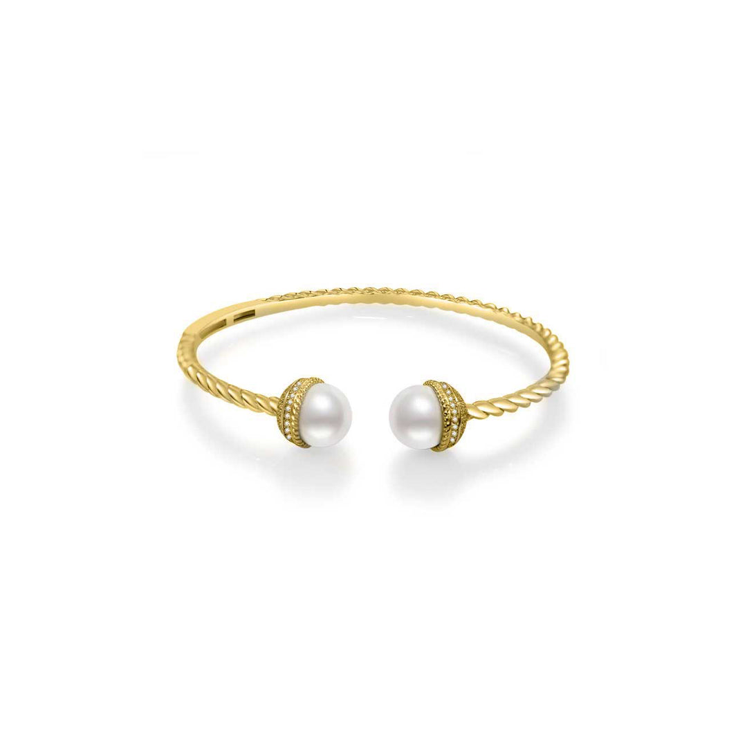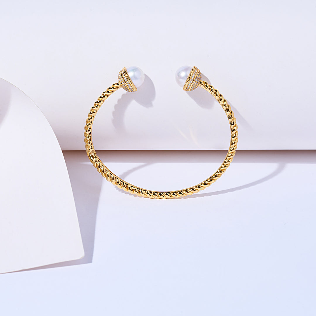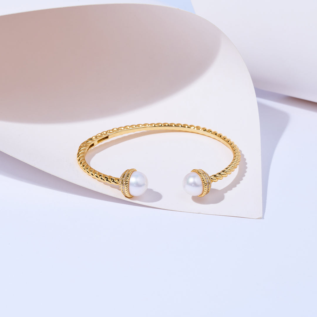 このパール ブレスレットは、最も愛されているブレスレットの 1 つです。先端に 2 つの光沢のあるパールが付いた、流線型の螺旋形は、流行に左右されず、スタイリングも簡単です。単独で着用することも、異なる色のブレスレットと重ねて着用することもできます。