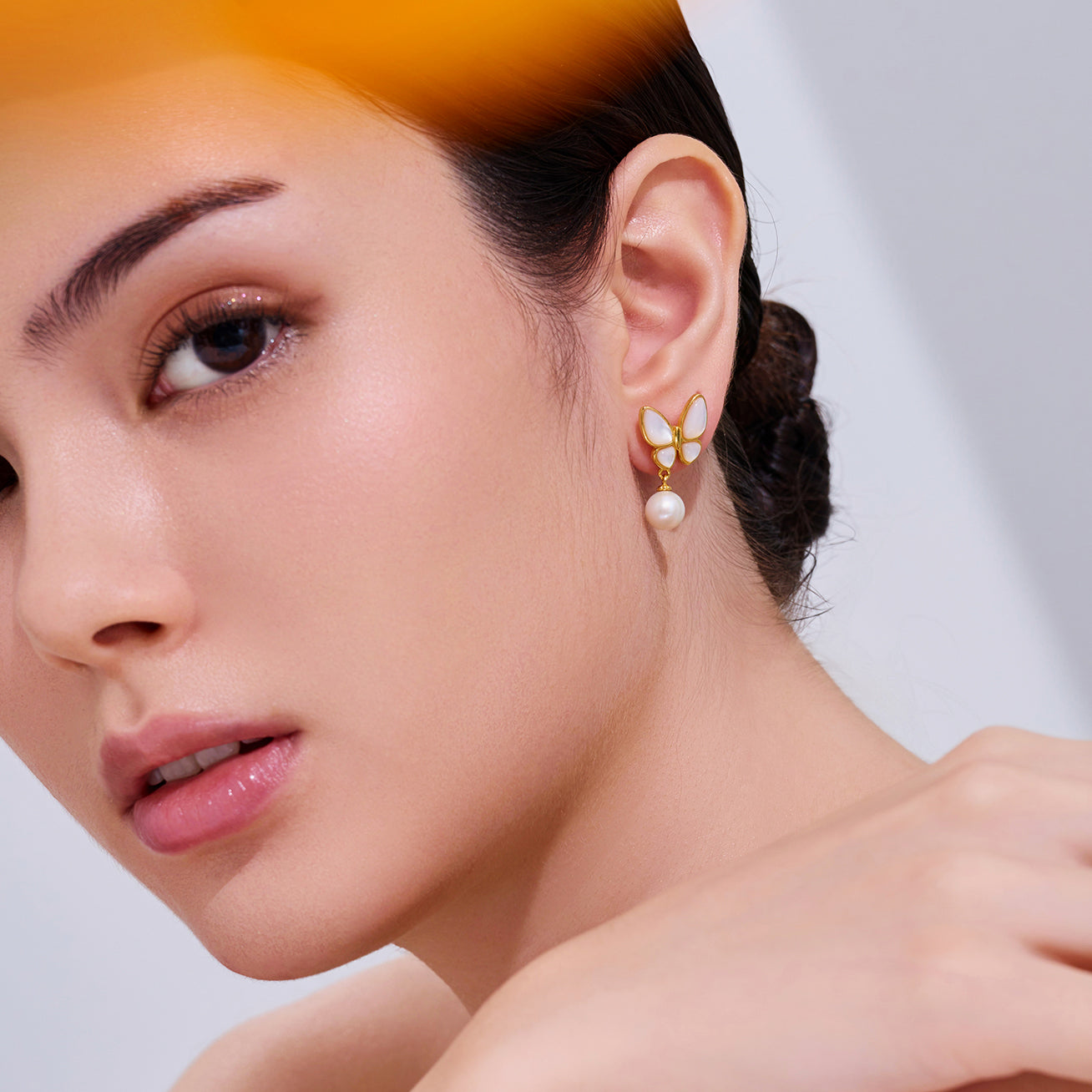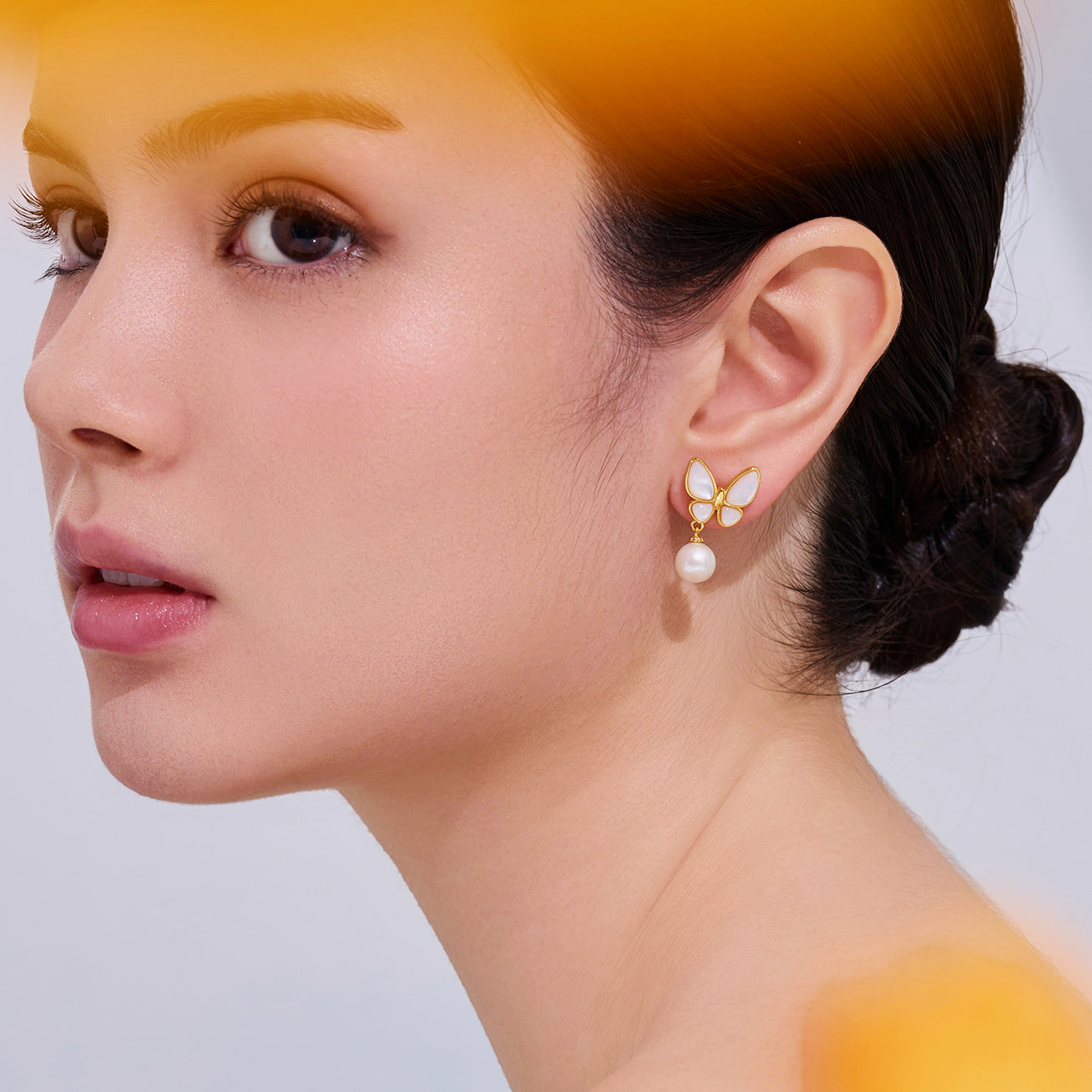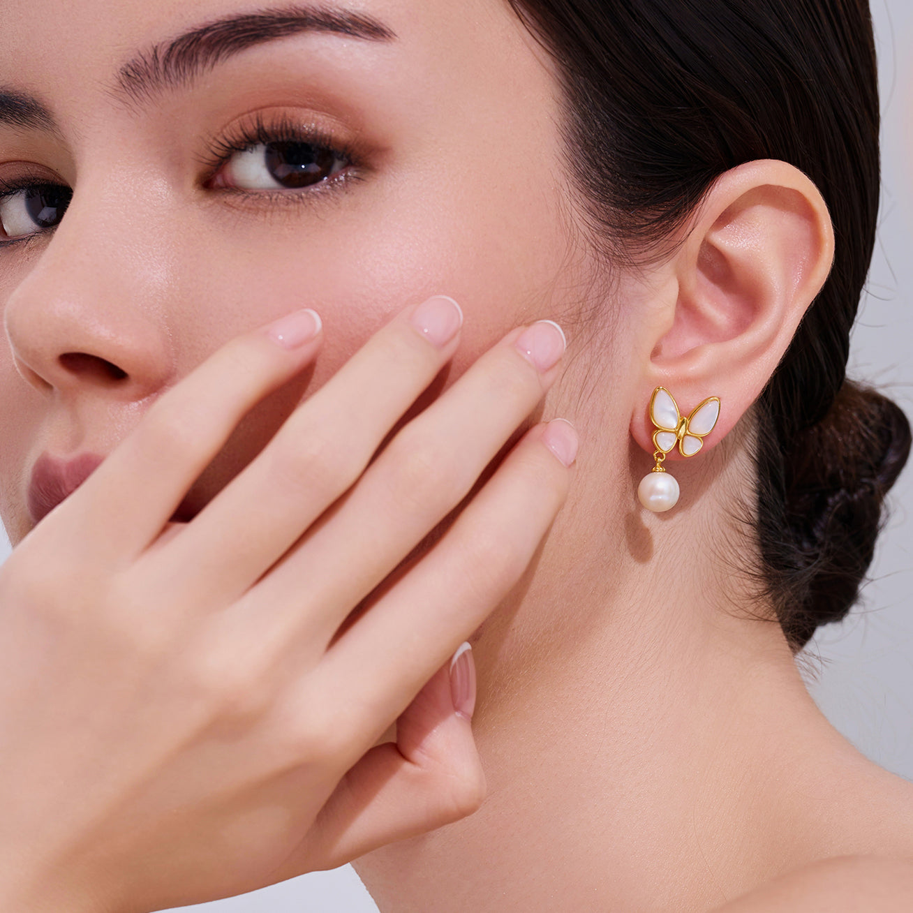 女性の心をとろける蝶のイヤリング。繊細でスタイリッシュ、新鮮で、とても美しいデザインです。キュービックジルコニアの蝶の羽が付いた一粒淡水パール、スターリングシルバーメッキゴールド。