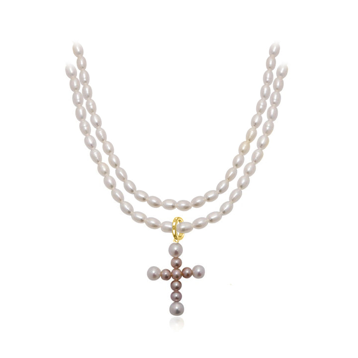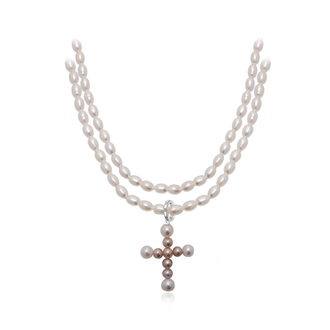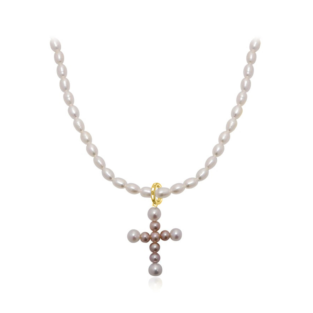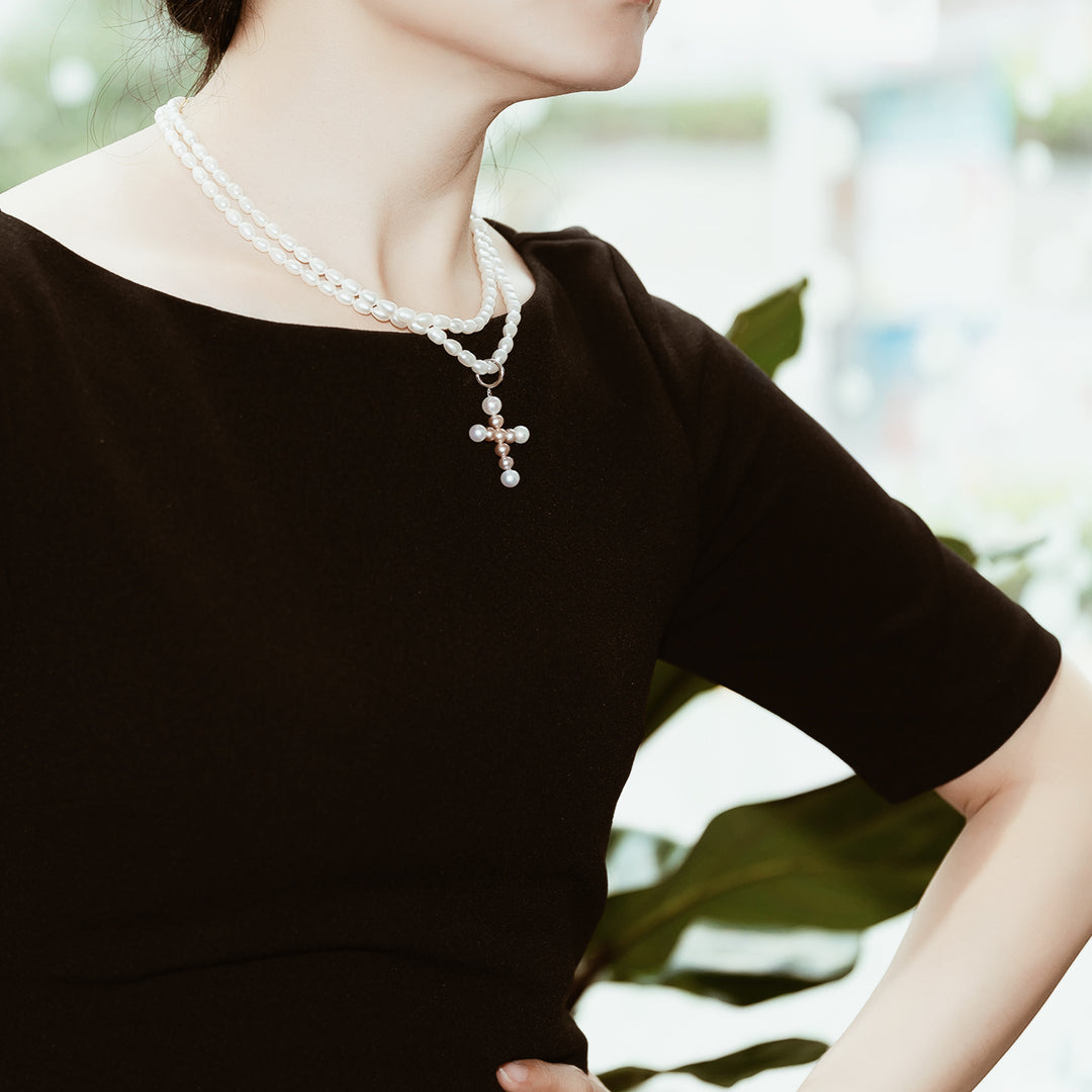 手選びされた光沢のある真珠から手作りされた傑作で、各ピースを飾る十字型のペンダントが特徴です。淡水ライスパールが輝くリングでつながれています。エレガントなイヤリングと一緒に着用してください。