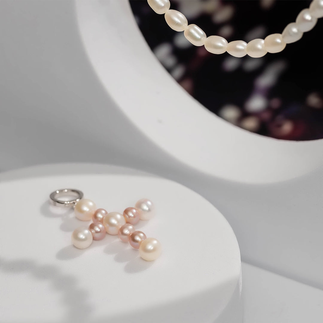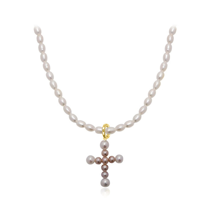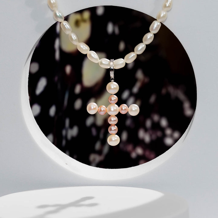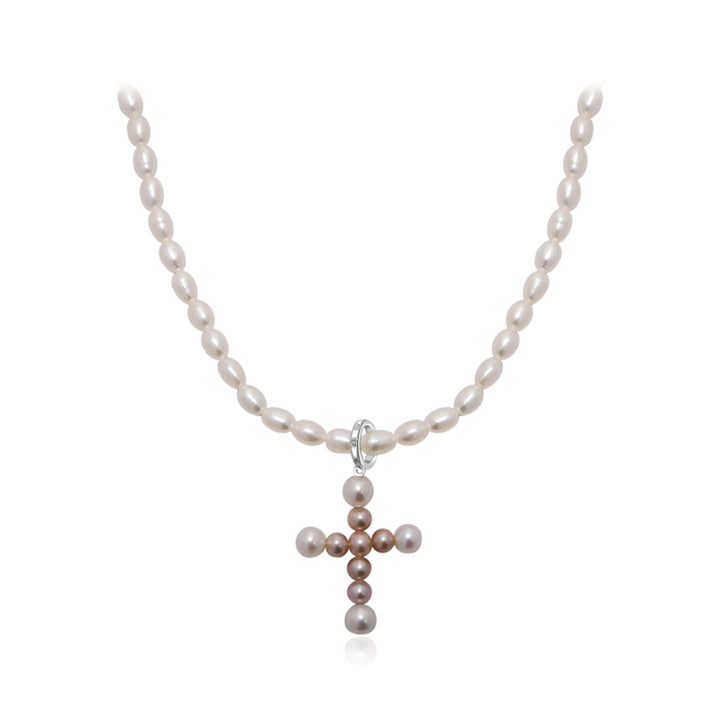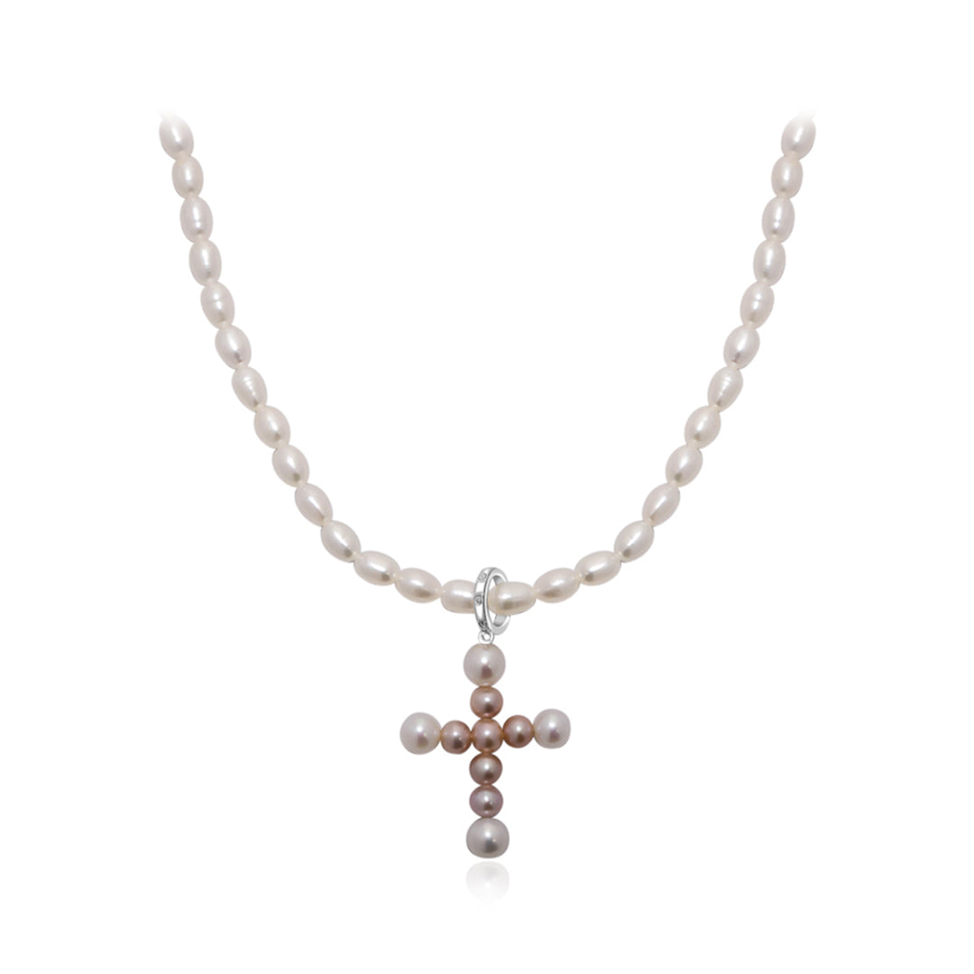 手選びされた光沢のある真珠から手作りされた傑作で、各ピースを飾る十字型のペンダントが特徴です。淡水ライスパールが輝くリングでつながれています。エレガントなイヤリングと一緒に着用してください。