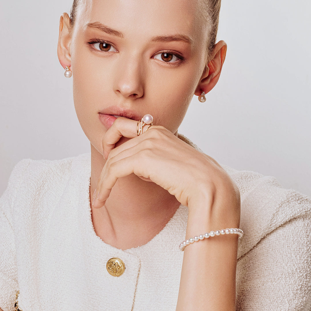 この18KのパールリングSi Dian Jinコレクションの一部で、特別なブライダルの瞬間にぴったりです。優雅に作られ、輝きに満ちたこの美しいリングは、きらめく存在感を放ちます。