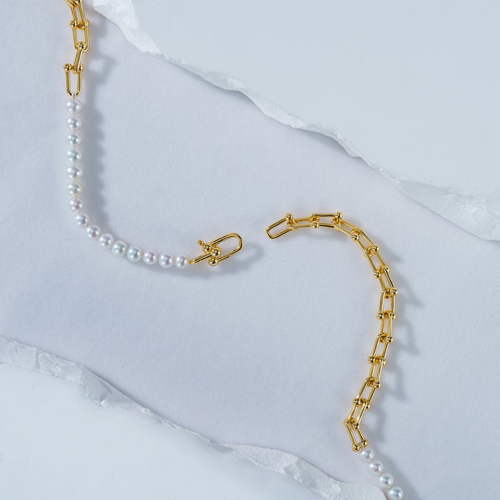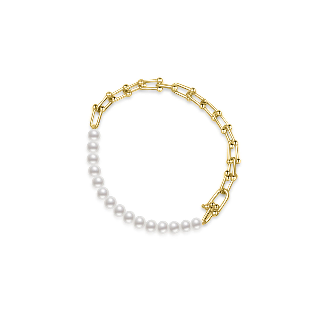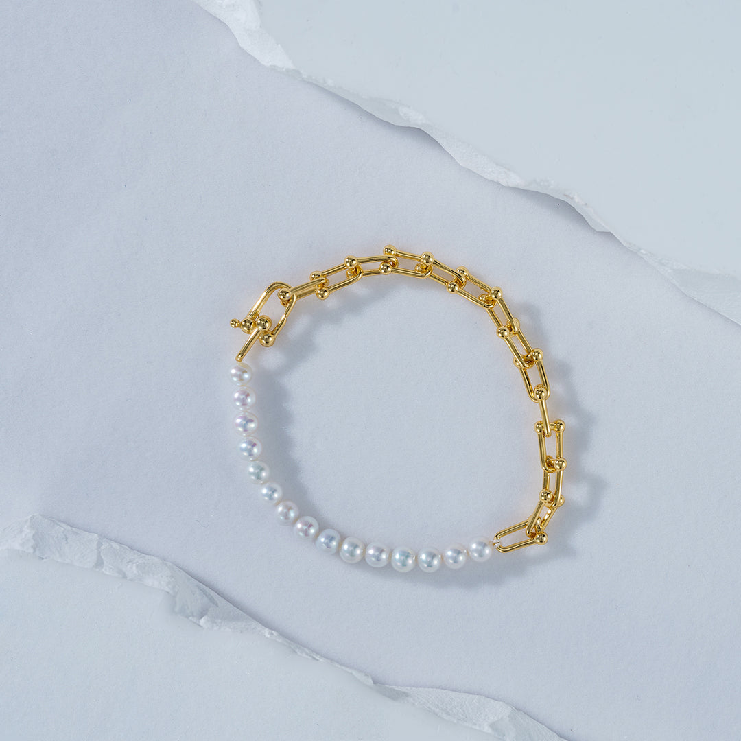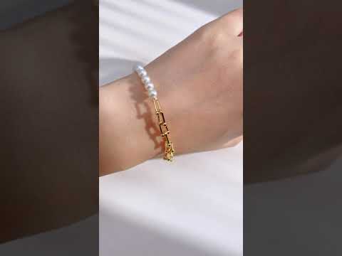 大胆な探検家にぴったりのパールブレスレット。トップの光沢パールが付いたメタルチェーンが、どんな服装にも大胆なアクセントを加えます。