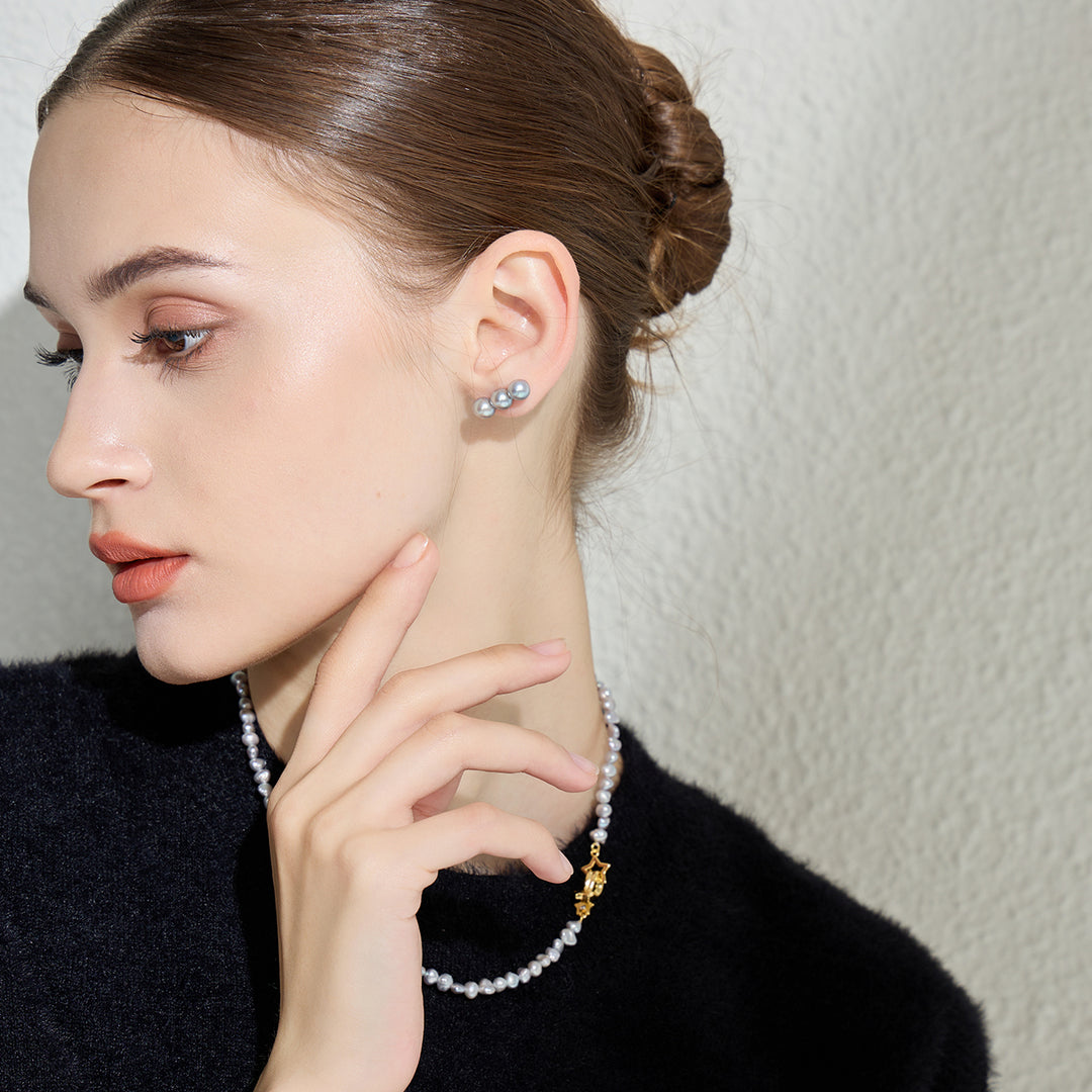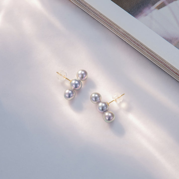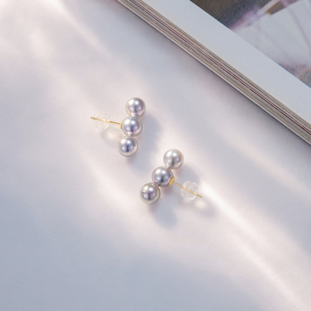 きらめくアコヤシルバーブルー パールが 3 つ揃って優雅に配置され、高級感と優雅さを演出します。