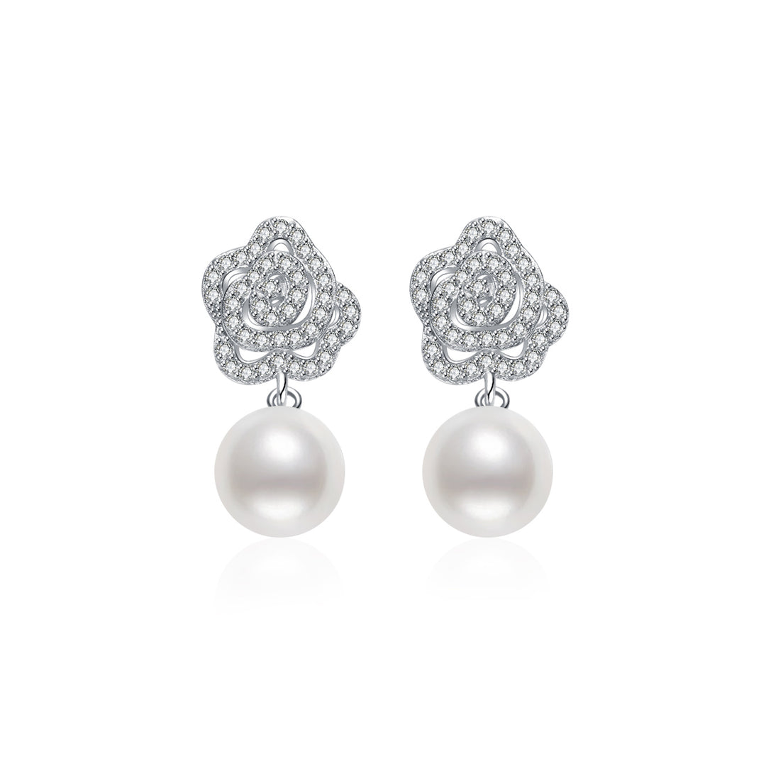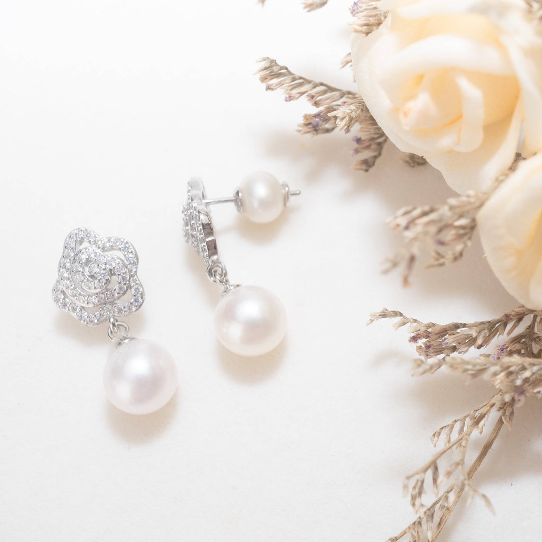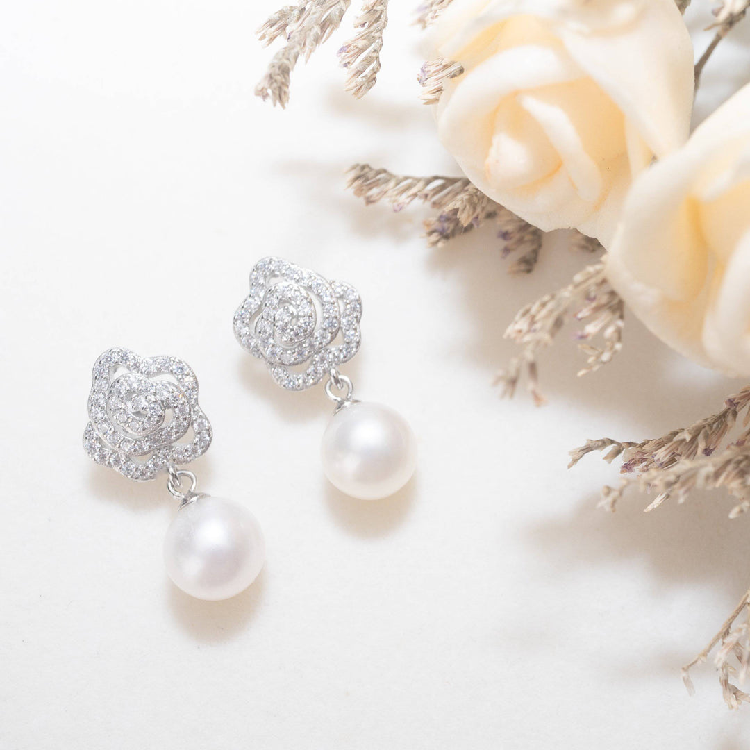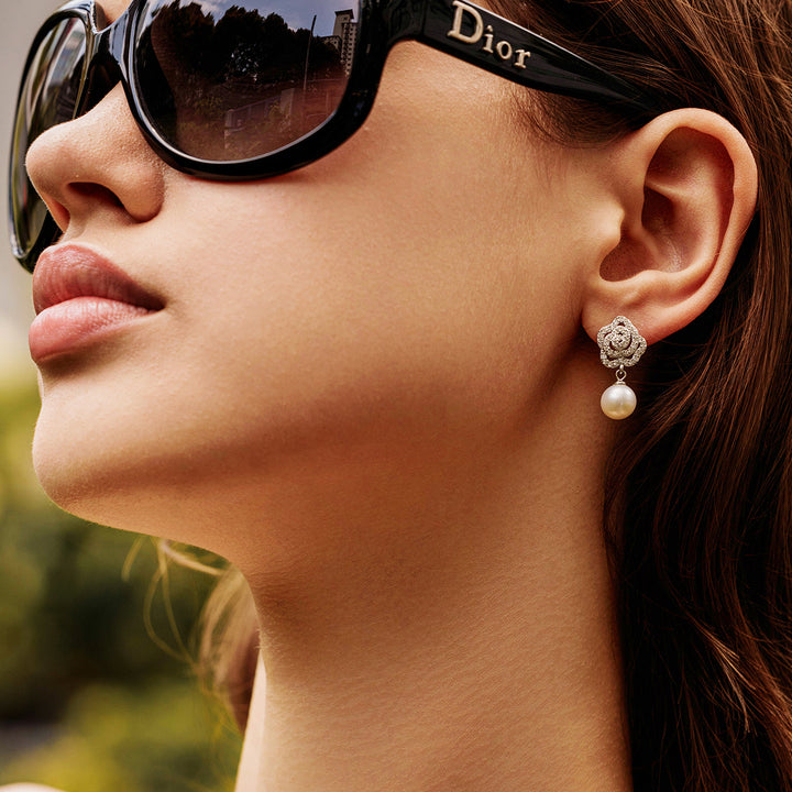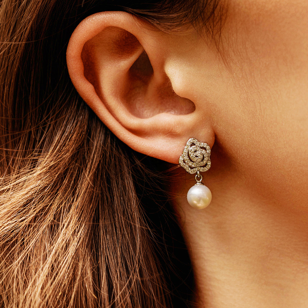 ブラックタイのイベントに着用できる、優雅さと美しさを持つ女性のための傑出した花柄のパール イヤリングです。  プレシャス フローラ パール イヤリング