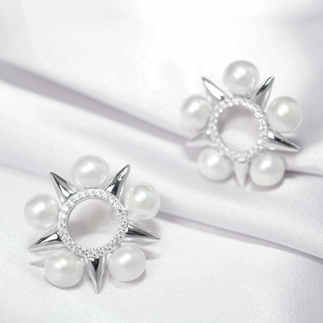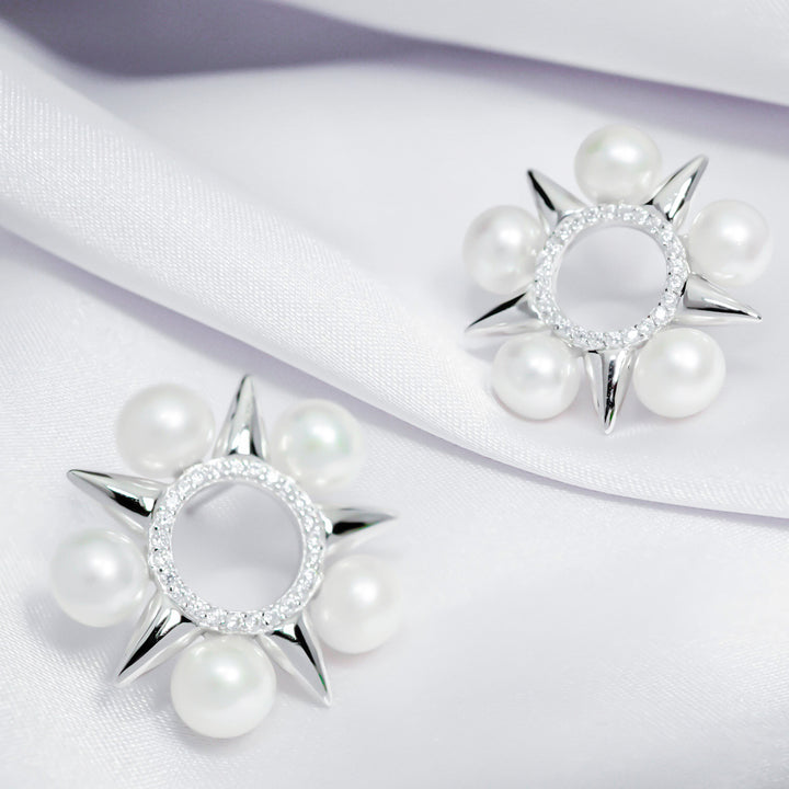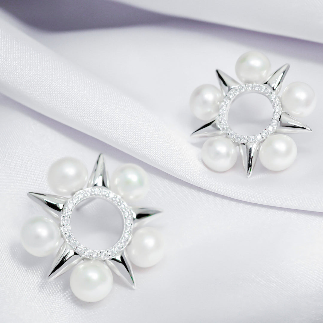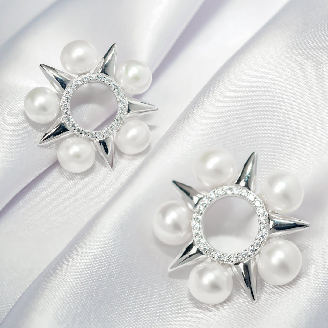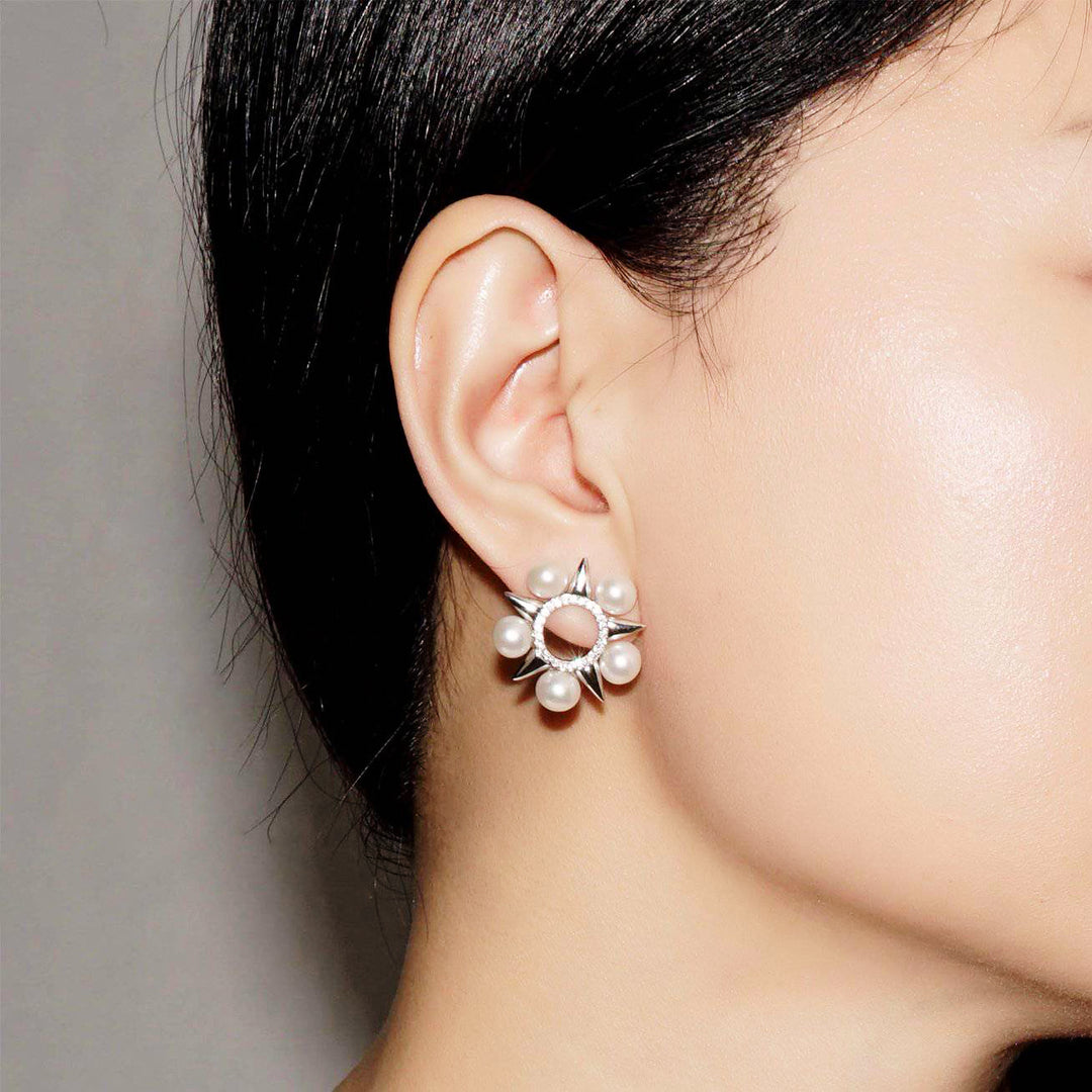진주 귀걸이는 반짝이는 별 모양의 스털링 실버로 주조되었으며, 5개의 빛나는 진주가 정교하게 장착되어 일상에 어울리는 시그니처로 착용할 수 있습니다.