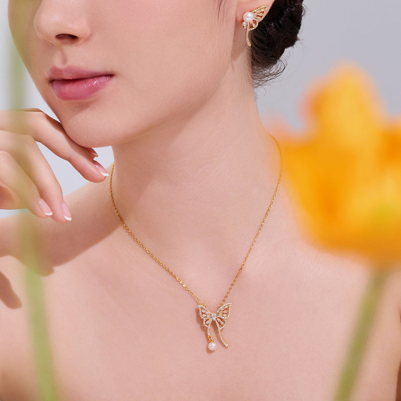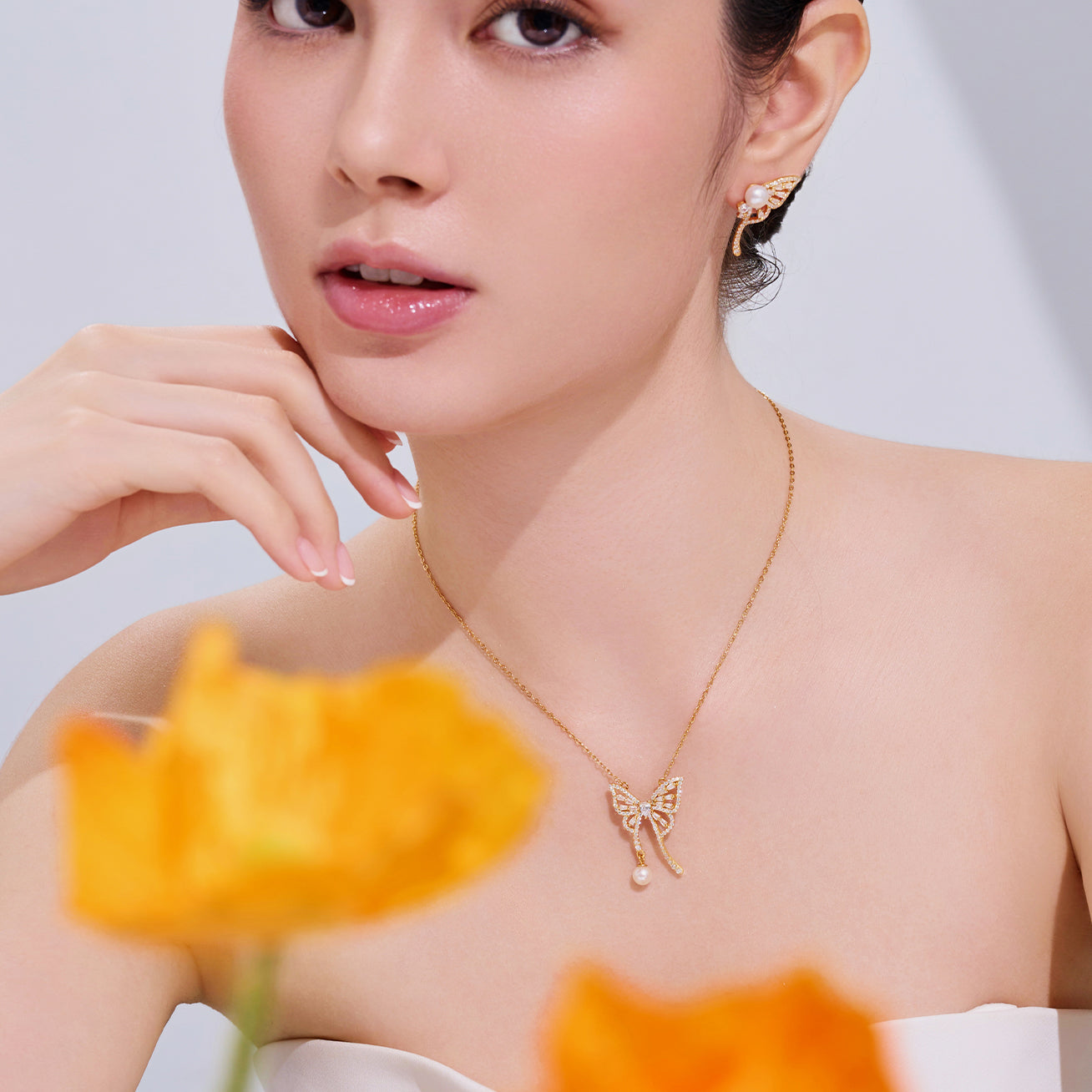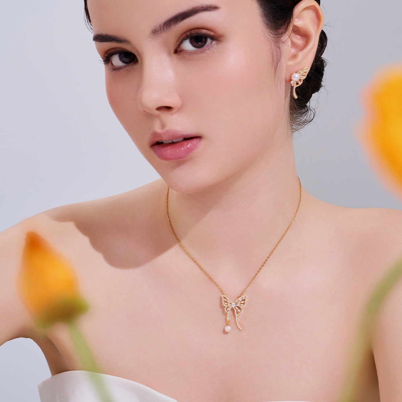 숲속 나비가 담수 진주를 만납니다. 이 세트는 매혹적인 바다와 강을 매끄럽게 연결하는 호화로운 정원 속 나비들을 포착하여 거의 마법과도 같습니다. 아름다운 흰색의 흐르는 드레스와 이 나비 진주 목걸이가 완벽한 조화를 이룹니다.
