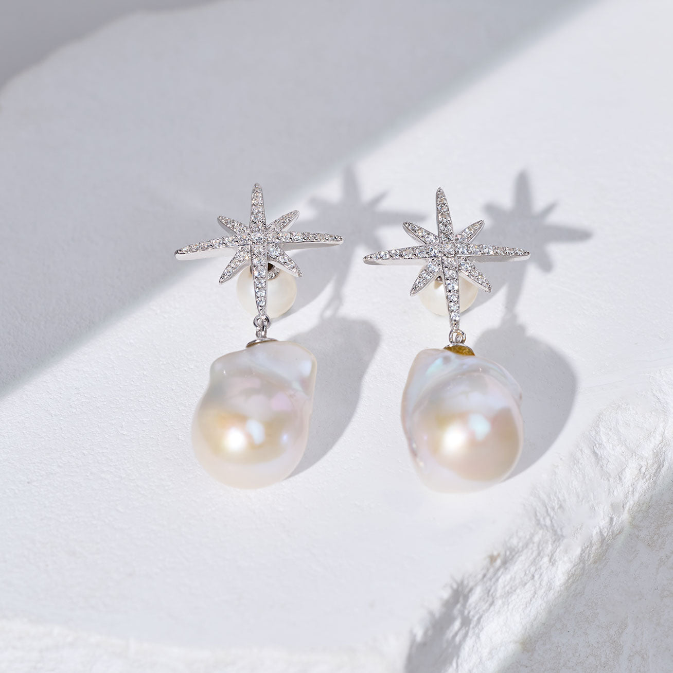 이 트렌디한 진주 귀걸이로 모든 파티에서 빛나세요. 별무늬 디자인이 특징인 이 Baroque 진주는 우아하고 세련된 느낌을 더해 결혼식이나 화려한 모임에 완벽합니다.