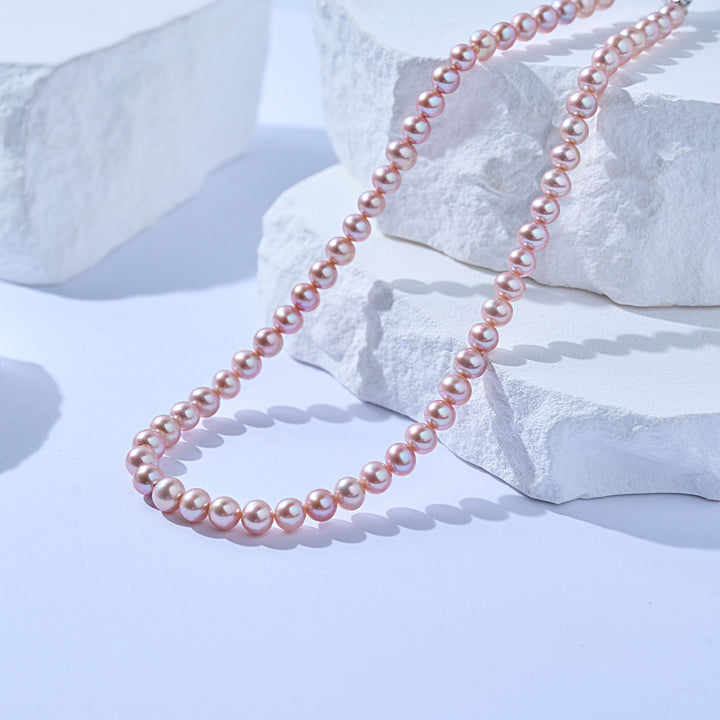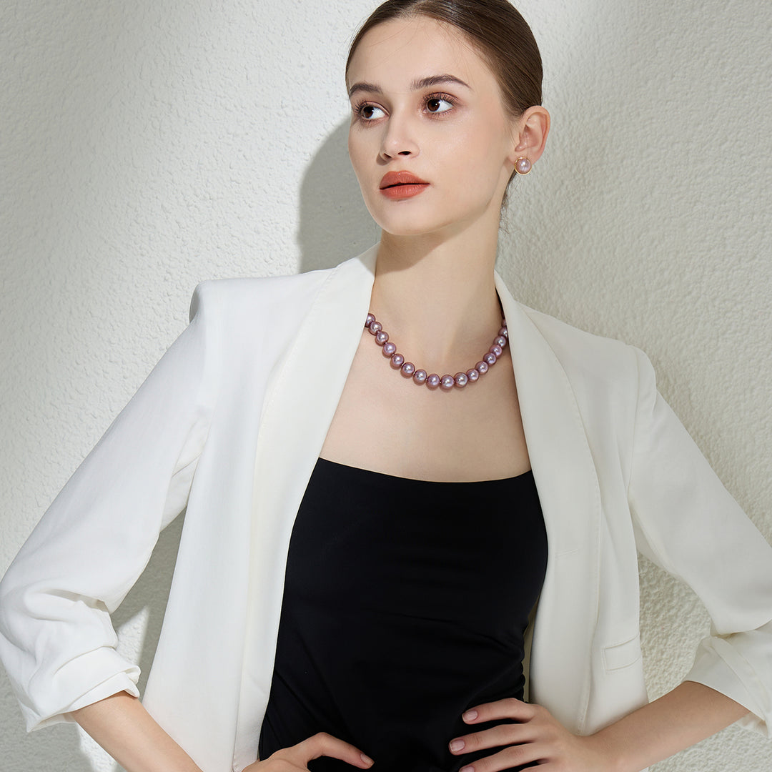 클래식 퍼플 담수 진주 는 크기와 색상이 세심하게 조화롭게 매치됩니다. 목선의 아름다움을 드러내기에 딱 맞는 길이의 진주 목걸이 . 세련되고, 고급스러우며, 클래식합니다. 모든 여성은 이런 진주 목걸이를 가져야 합니다. 정교한 진주, 클래식한 목걸이.
