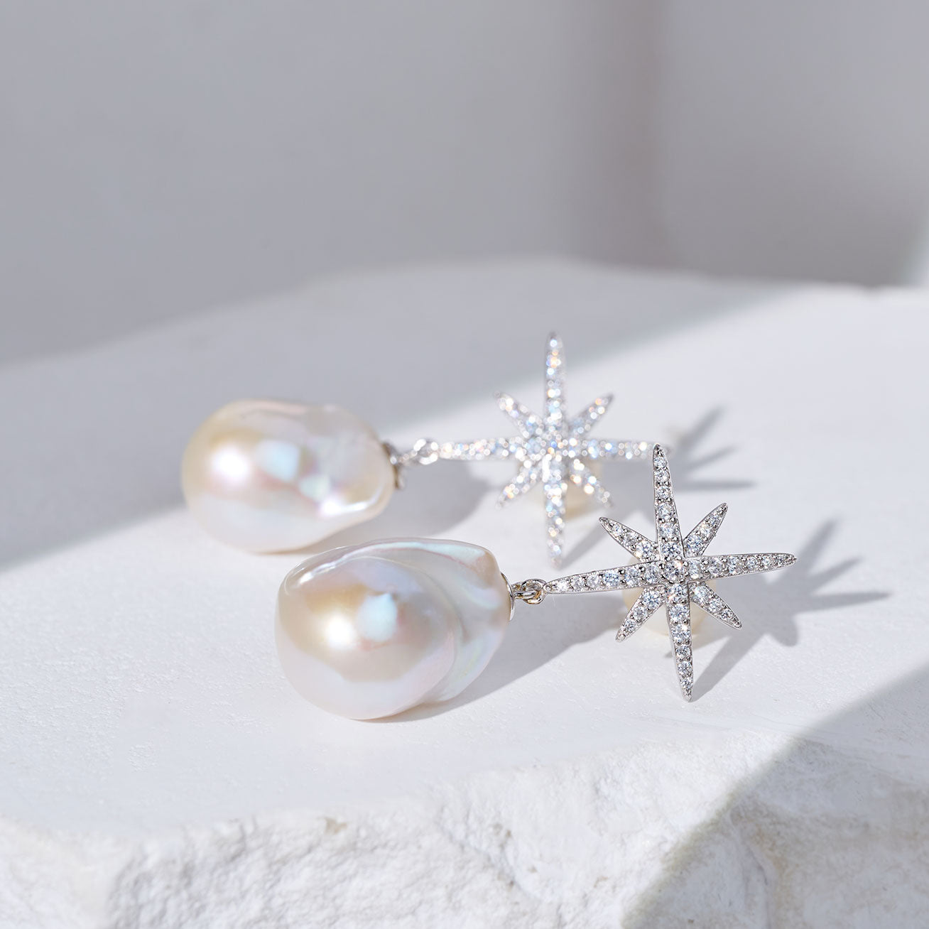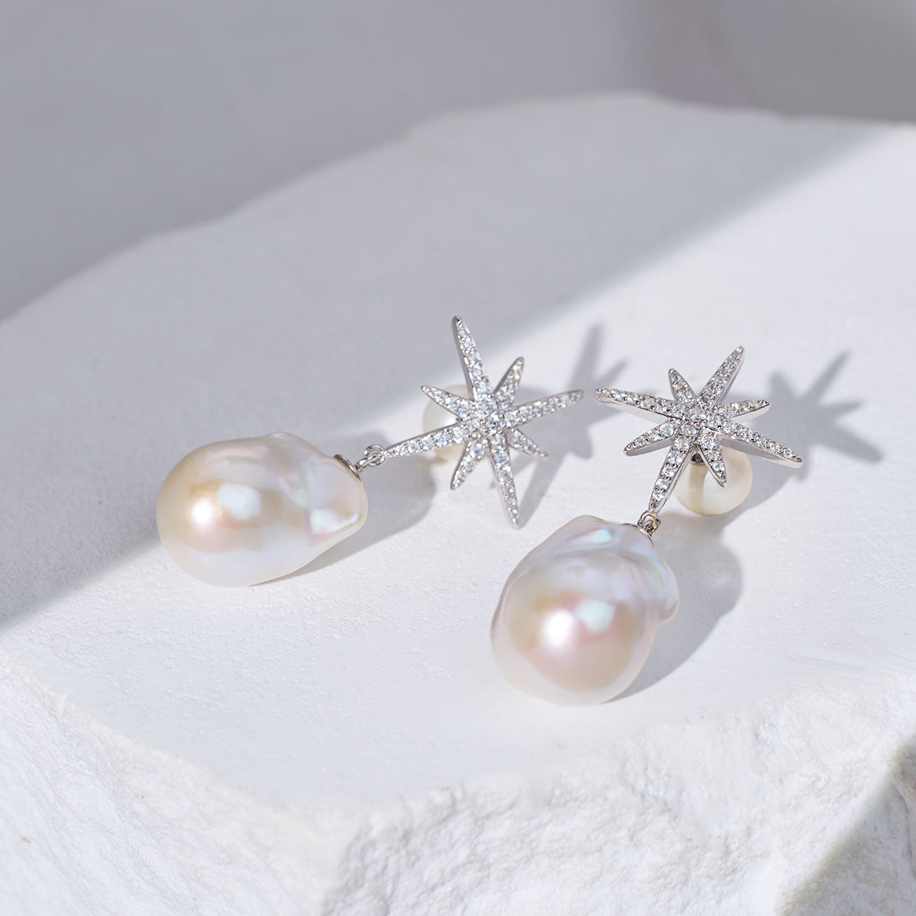 모든 파티에서 빛나는 이 트렌디한 진주 귀걸이와 함께하세요. 별무늬 디자인이 특징인 이 Baroque 진주는 결혼식이나 화려한 모임에 완벽한 우아한 세련미를 선사합니다.