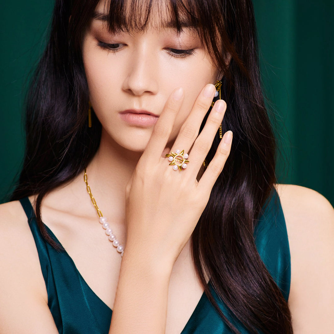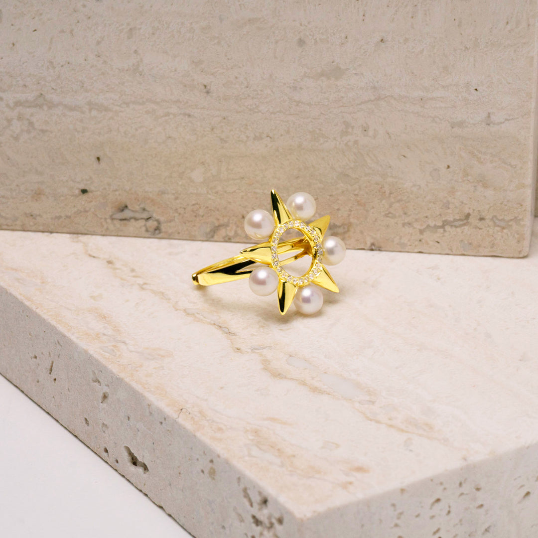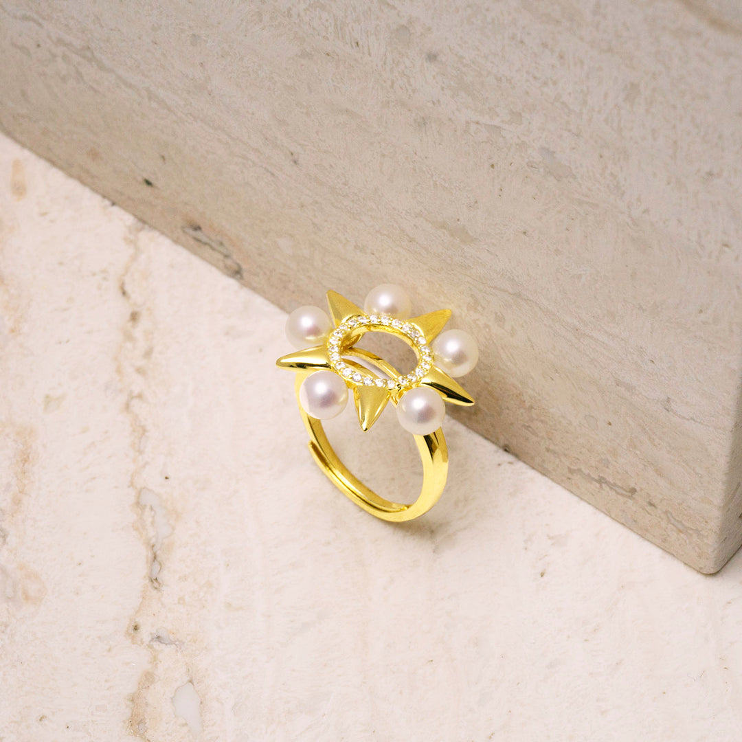 진주 반지는 반짝이는 별 모양으로 스털링 실버로 주조되었으며, 다섯 개의 빛나는 진주가 정교하게 장착되어 있어 매일의 시그니처로 착용할 수 있습니다.