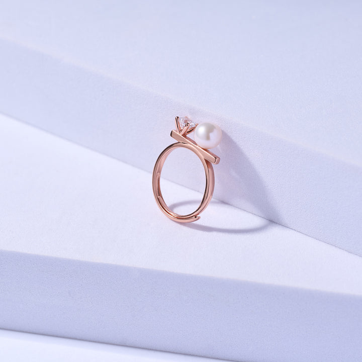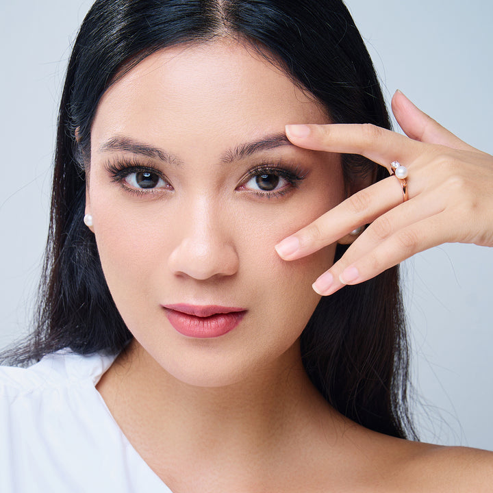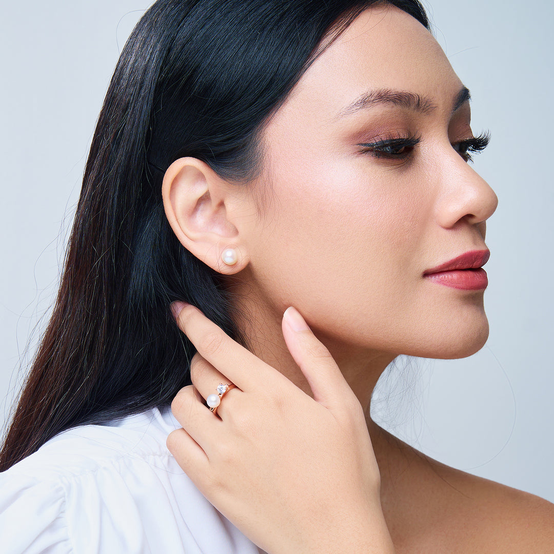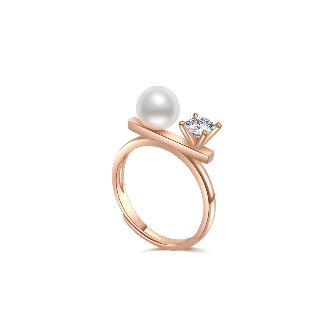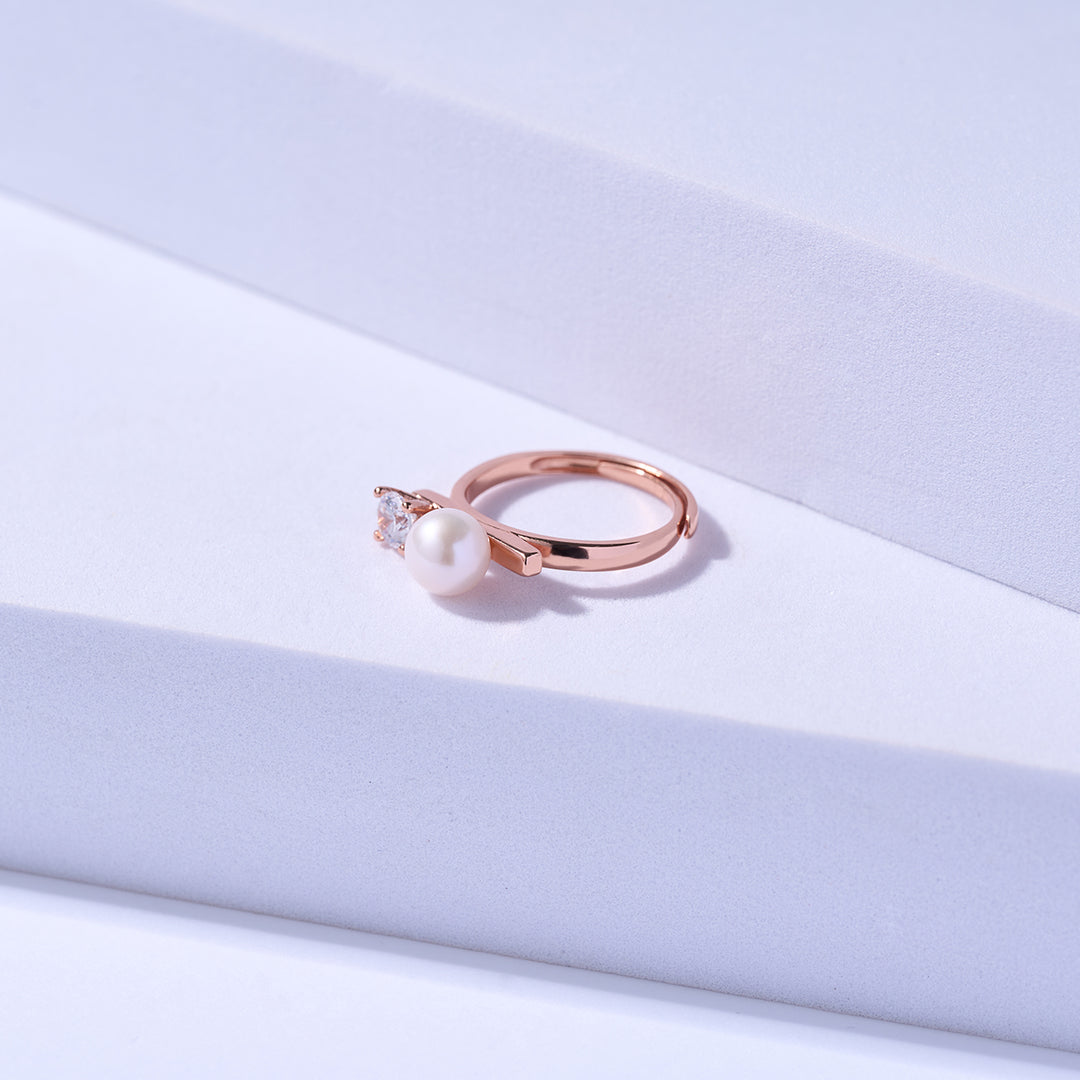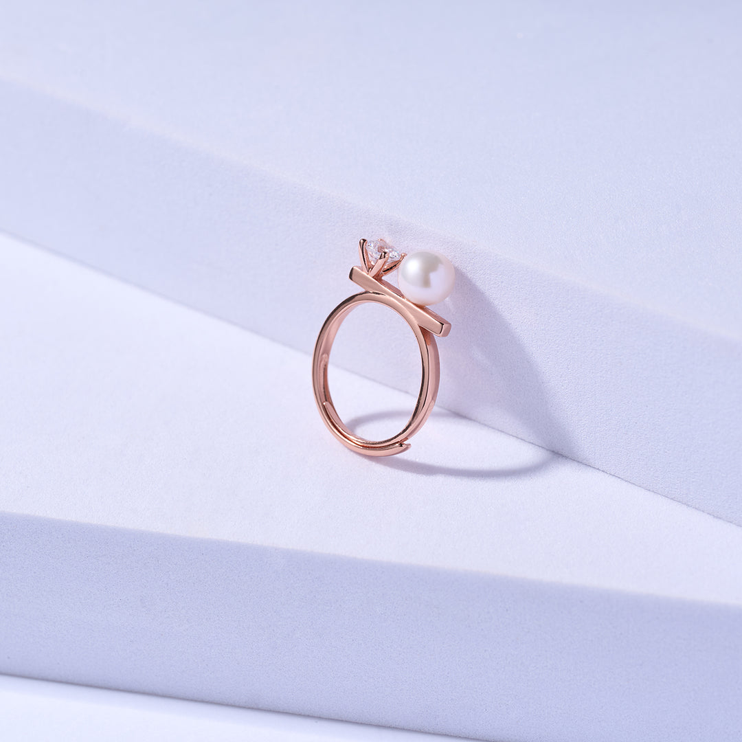 Reka bentuk kontemporari, sofistikated dan bergaya, cincin mutiara ini mempunyai kilauan istimewa dan merupakan ciptaan yang unik. Cincin untuk selama-lamanya, untuk wanita yang berani berbeza.