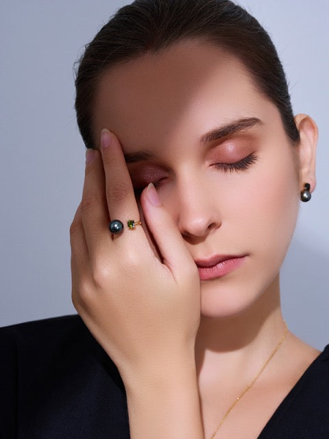 Cincin dengan perwujudan sebenar kemewahan dan keanggunan. Karya yang direka dengan teliti ini menampilkan Tahitian Pearl yang memukau dengan warna hijau merak yang menawan dan batu permata Spinel Hitam yang menakjubkan menghiasi reka bentuk, menambah sentuhan kontras dan kehalusan.